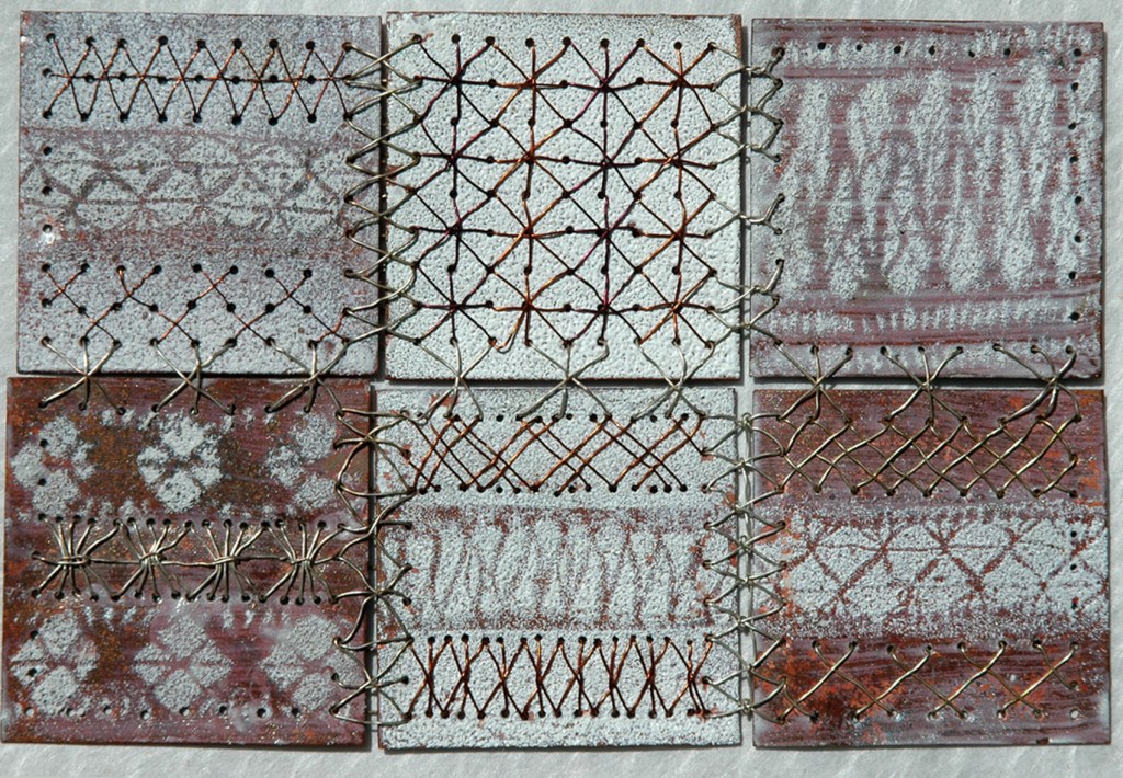 Another idea which I had also been developing is patchwork enamel, I had quickly worked out that this was the easiest way to produce enamel fabric, but the thought of drilling all those holes to stitch the plates together, put me off – but now I was used to working with the metals so I returned to a small sample I had made in the first year of my enamelling experiments.