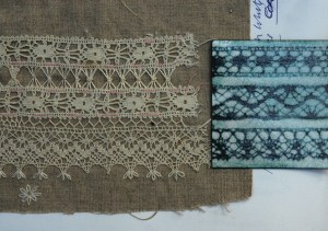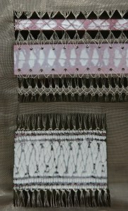 I looked again at other types of samplers which could be developed into drape- able fabrics…this small design below was for embellishing espadrilles in a book I had written called White on White by Coats Crafts UK now sadly out of print. I developed a strip sampler as with this type of construction the stitched strips of enamel can be rolled and it behaves much more like fabric, this led me to many more developments, one of which will be used for the Severn Seas Skies hangings featured in the last posting on the blog.