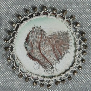 At the research department at UWE. Bristol I was surrounded by researchers into enamel who were were making such exciting and unusual things and I didn’t realize at the time that I was working with enamellers at the forefront of innovation into this craft,  and I was being given the chance to develop textile techniques within their research area. I was both excited and daunted but decided to stick with what I knew, stencilling and stitching. I used lace, Broidery Anglaise, crochet, any fabric that was patterned with hole and I drilled holes in the metal plates, prior to enamelling, in order to stitch. I hated this drilling; to stitch even moderately neatly you have to drill very neatly and you have to sort out all the placements first…my work books are full of stitch diagrams ….so how else can I get these plates onto the fabric without the drilling?