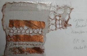 I bought some amazing woven metal fabrics from The Cloth Clinic, the owner – and at the time a fellow researcher at UWE Bristol, Janet Stoyel – let me buy some of her specially woven fabrics –  sadly no more were made available to me after this. But I used these particular fabrics to make a series or samples based on traditional white work sewing. The  embroidered scrap of copper below is from this collection of metals as are most of the metal fabric samples in the work books; although some of these metals are available elsewhere the Cloth Clinic’s fabrics are really special and worth looking our for. But cost and unavailability of these metal fabrics made me rethink how I could develop these ideas, I even thought of taking up weaving some for myself from copper and steel wire on a small frame…still a possibility…….