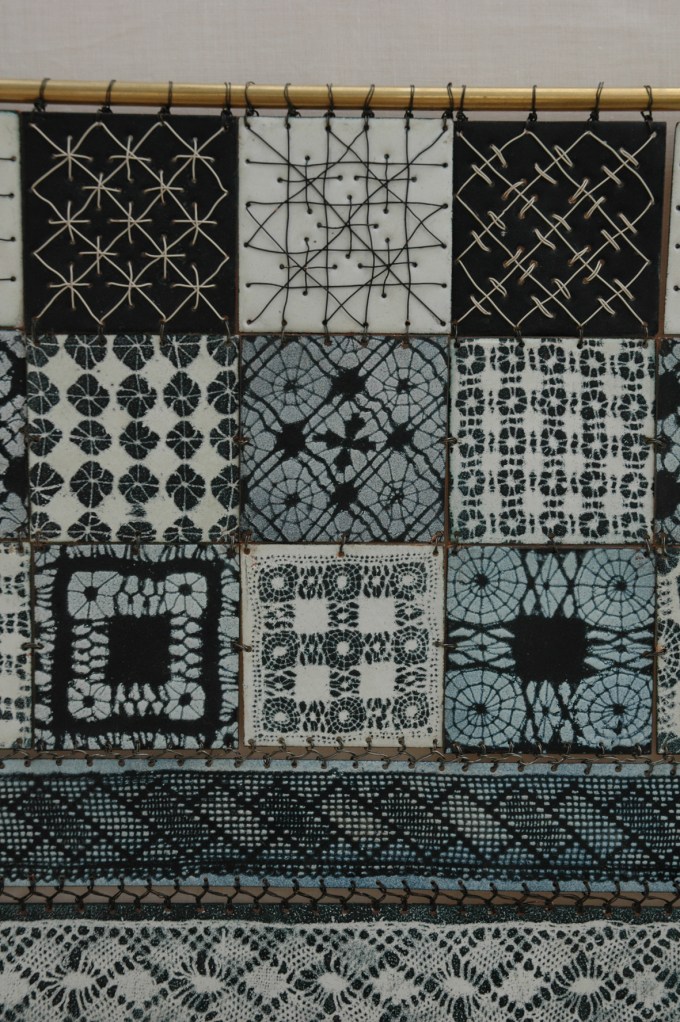 detail of top of Black Work Patchwork, with stitched and stencilled enamel.