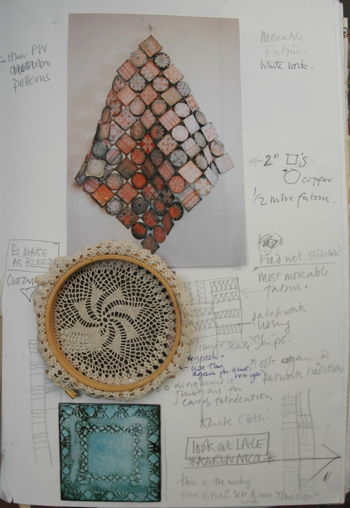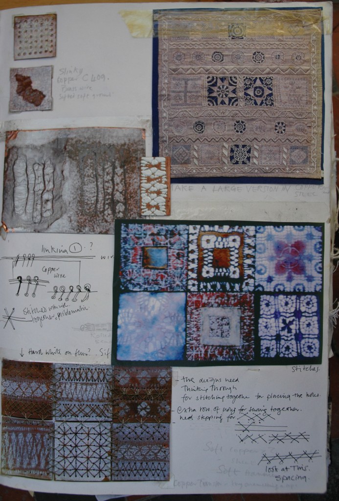 I made a larger and simpler version of the sample above and the piece of fabric is about 90cms square, a yard of fabric.The separate plates are stencilled and then stitched together with white coated copper wire, suddenly I had a piece of  fabric that draped when held in my hands. Below is the page from my research book with one of the stretched crocheted fabrics used to stencil patterns onto the copper plates.