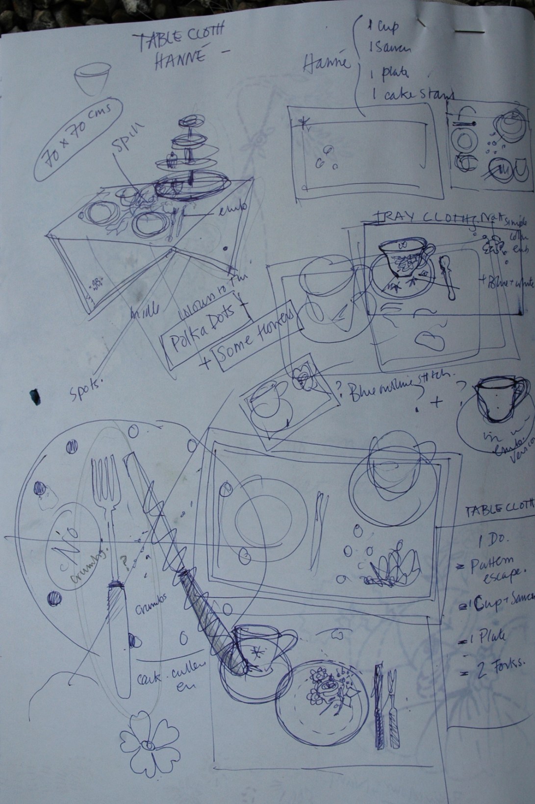 The next drawings were on the linen tea-cloth in water erasable pen, Hanne made the actual pieces for me to work from and I took them home to my studio and set them out to draw around.