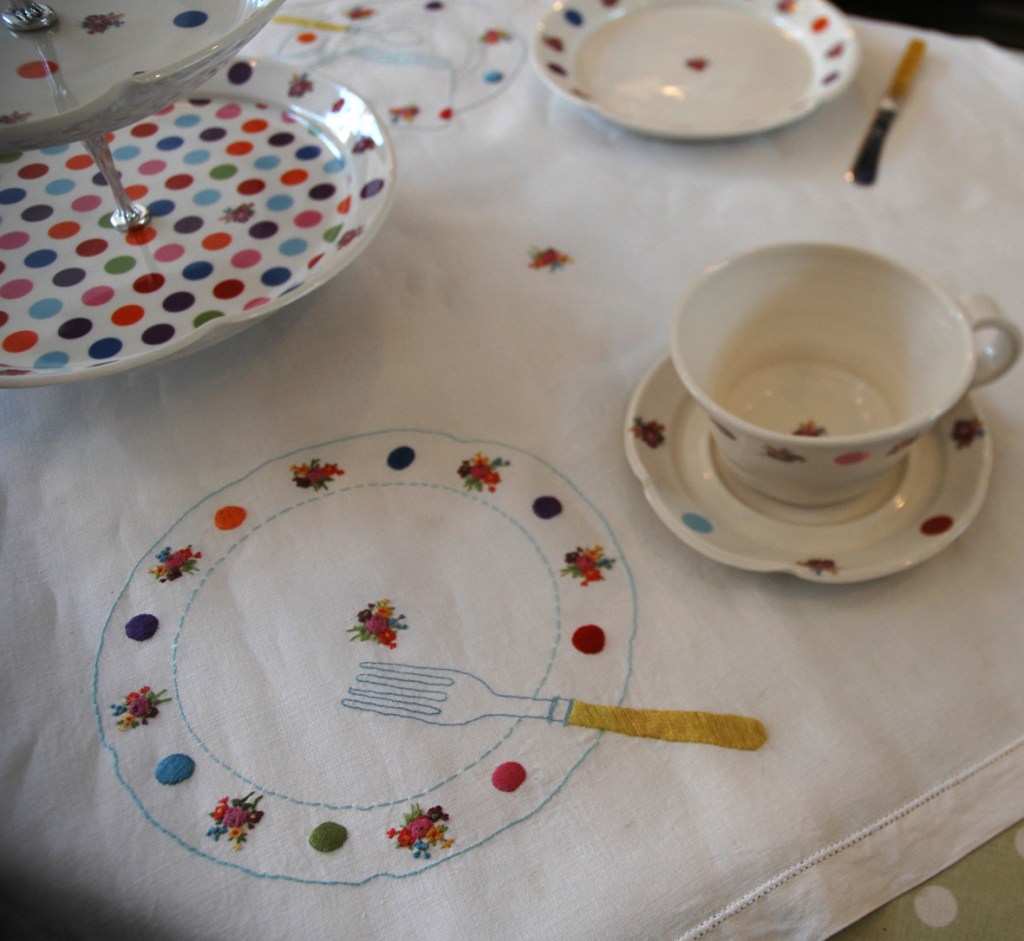 Here is a close up of a section of the cloth complete with the embroidered cake fork, the real butter knife used as the reference, can just be seen in the background.