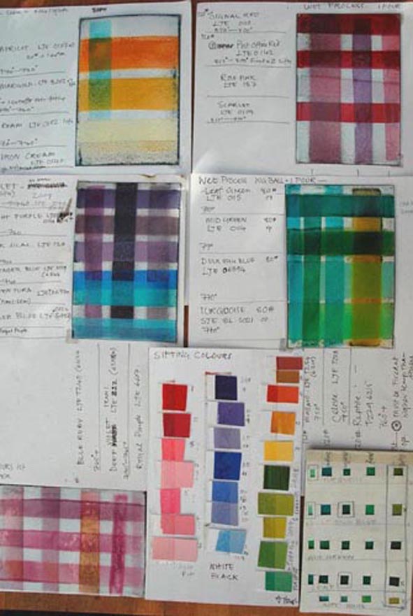 In my enamel workroom though things are even livelier, enamel is impervious to light and weather so I keep all my old samples on view, they are constantly referred to and I think it amusing that even my metal and glass samples look like mad gingham fabrics.