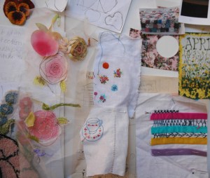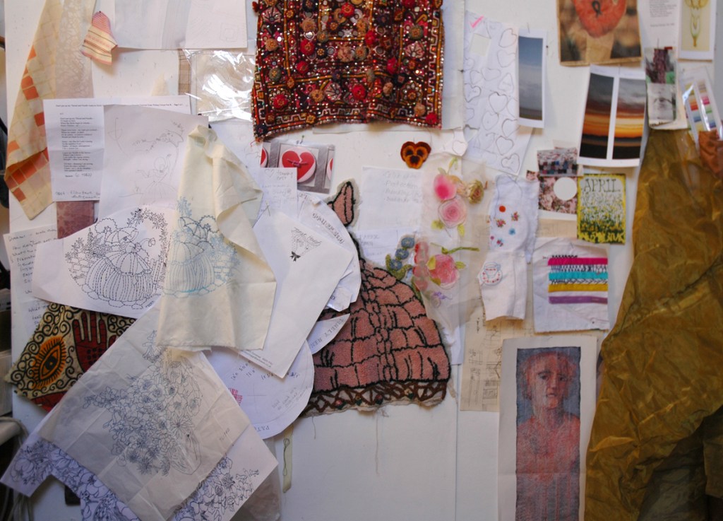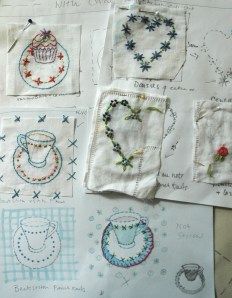 The idea of samplers being the traditional regimented rows of perfect stitching is of no practical use to me. The samplers we see in museums had more to do with illustrating young girls’ good behaviour and patience than their creative ability to problem solve – which is how I see the sampling process, an absolutely key component of any making project. I usually collect my samples together and pin or stick them into my work books when I have finished the project. They are often all the evidence that is left of my commissioned work, apart from the pictures of the finished image. But until that happens they are pinned to a wall as constant reference.