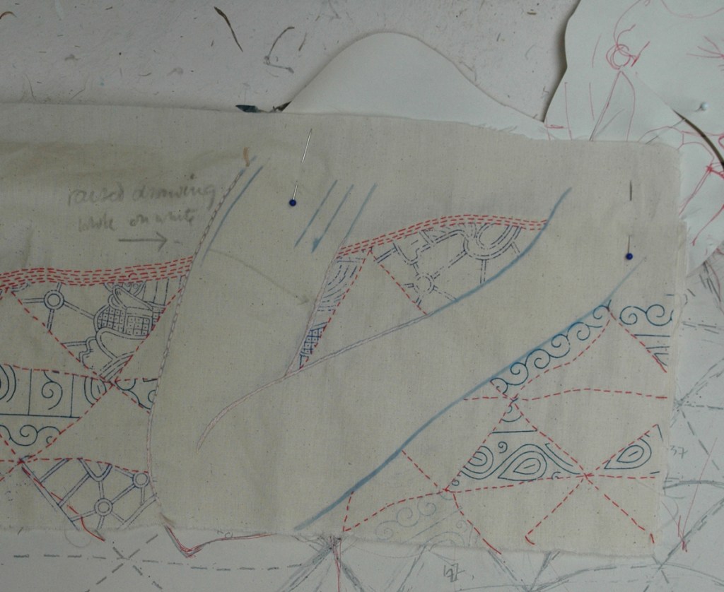 The most important project this week is the book presentation as it has to have 3 spreads, or double pages, with all the stitched designs, illustrations, technical diagrams and information organised in time to get it to the art editor who will sort out the overall look of the finished book for printingto show it to hopeful publishers at the Frankfurt book fair in October – as you can see I have been influenced by the work I did with Hanne on the tablecloth – or rather my commissioning editor was…….