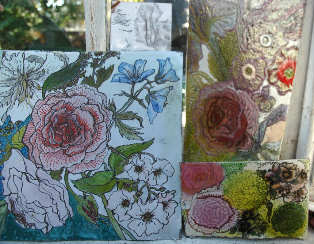 and on another windowsill are placed the drawn and painted samplers I made for the Chintz Collection in the Enamel Garden (see the Gallery Pages) sadly these are the only flowers displayed in my old conservatory.