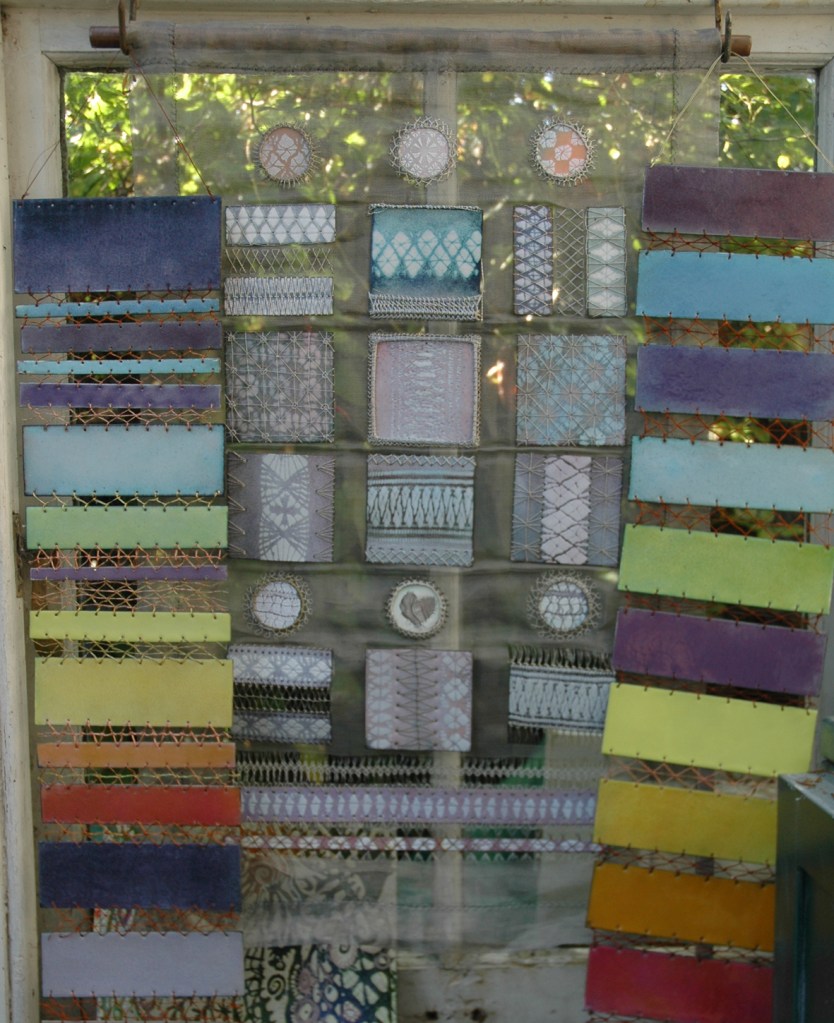 All around the enamel studio samples are set out, here the enamel skies are hanging next to my first large stitched steel sampler,