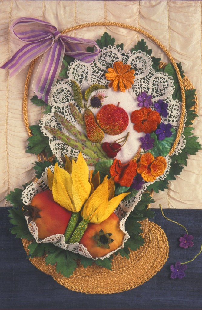 This is Harvest Festival time and in celebration of the season I am featuring the Edible Woman, alternatively The Prize.  She is a member of  the Flora Embroideries and was first imagined as a mate to The Giant Vegetable Man in the Flower Show blog. He had to have a mate made for him, even though he is pug-ugly, it would be sad to let all that male vitality and virility go to waste.