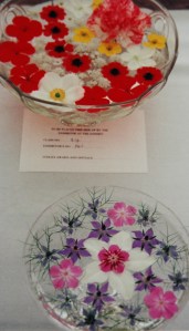I thought of the lovely dishes of fruit displayed at the local flower shows often arranged on paper lace doilies and also the bowls of water containing heads of flowers arranged in patterns so delicately displayed.