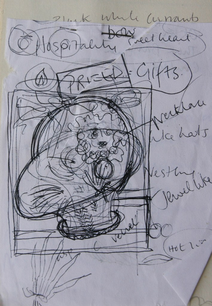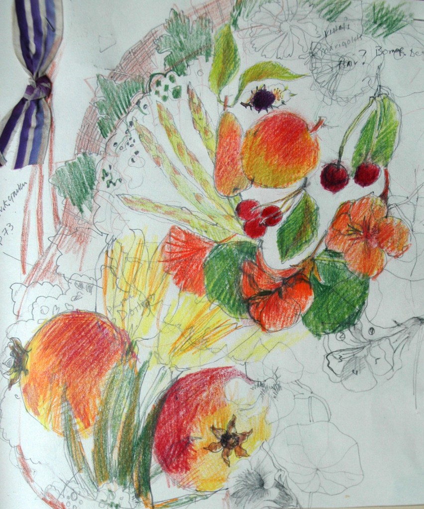 The first idea I had for her was as an earth goddess, all burgeoning breasts and stomach, lascivious and wanton…a good match for him. I made several drawings but couldn’t bring myself to actually embroider them; she was not to be a figure of ribald humour like him and I did not want her to be sniggered at in the giant vegetable show .