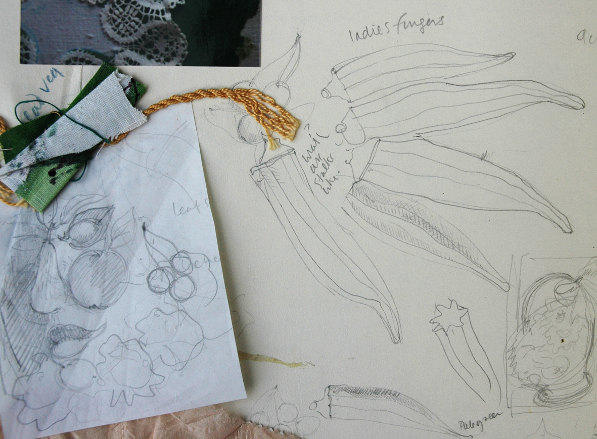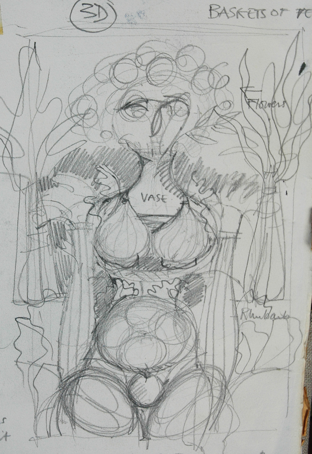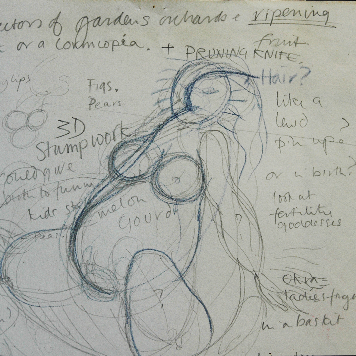 The first idea I had for her was as an earth goddess, all burgeoning breasts and stomach, lascivious and wanton…a good match for him. I made several drawings but couldn’t bring myself to actually embroider them; she was not to be a figure of ribald humour like him and I did not want her to be sniggered at in the giant vegetable show .