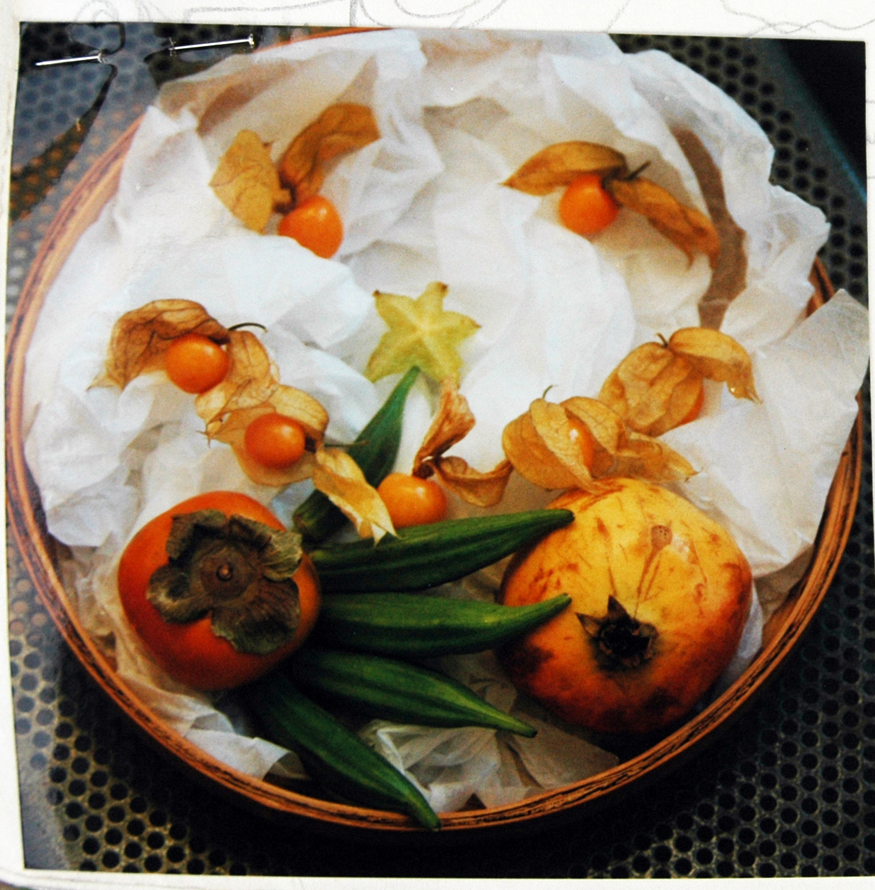 My lady was beginning to take shape in my mind, but how to make her face from edible things?I bought some exotic fruit and tried to arrange them into a face – this was not easy, the first attempt was really dreadful, like a fat unhappy drunk pumpkin woman, the only things that worked were the 5 okra as ladies fingers and the pomegranate and persimmon looked hopeful as breasts…….