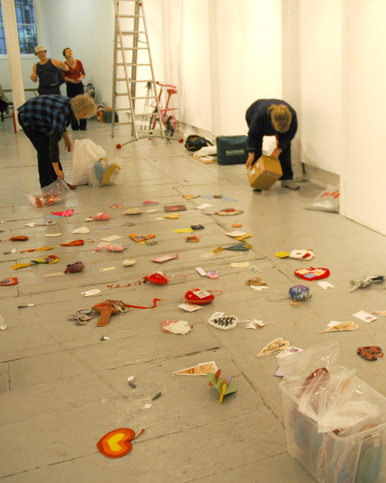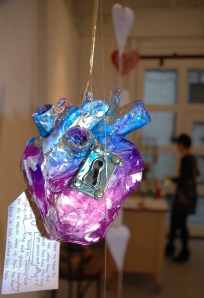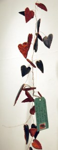 I was given the job of hanging the first wall of hearts with a partner; they had all previously been strung out on lengths of fishing line with an elegant weight at the end – our first job was to unravel the lines and get them into order on the floor –