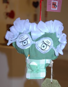 the Fish heart has a label saying “only dead fish go with the flow” and the funny face is for a well remembered and much loved grandmother