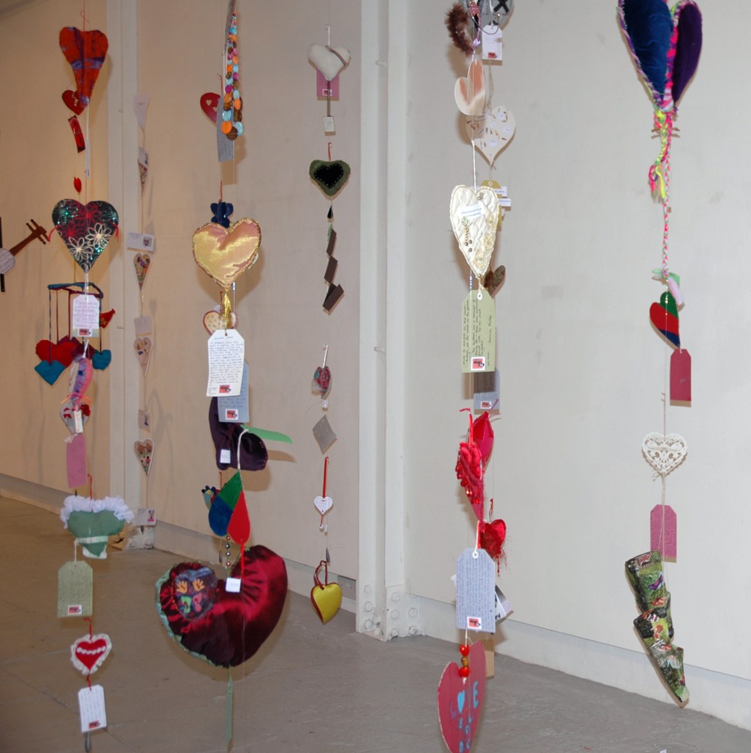 I arrived on Thursday afternoon to help a team get the exhibition hung; it was the usual scene of everyone standing round looking a bit stunned and wanting a cup of tea; but within half an hour we were all working away to plans by Jan Connett who organised the whole project. There were about 10 people in all coming and going – most of them in for a long night, I had only a few hours but had volunteered for card making duty when I got home. Everything goes towards 3 charities the Children’s Hospice South West, the British Heart Foundation and the African Street Children Organisation and most of the hearts can be bought from as little as £5.00