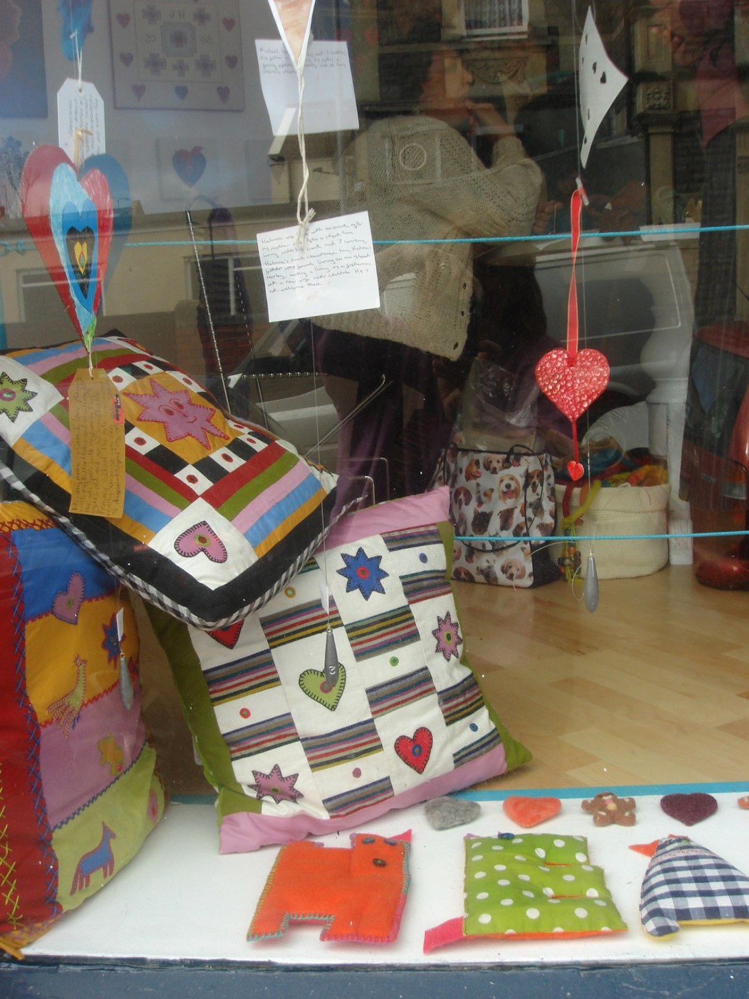 One of the main things I want to achieve with Heart Space workshops is to introduce people to the basics of designing textiles, not just making for making’s sake – nothing wrong with this – but I feel that designing for a purpose is a surer way to  focus and develop ideas and skills, so one of the simplest of our one day taster workshops will be to design and make cushion covers – and here are some of mine in the window, plus the alphabet animals I designed for the parent and child’s Saturday classes.