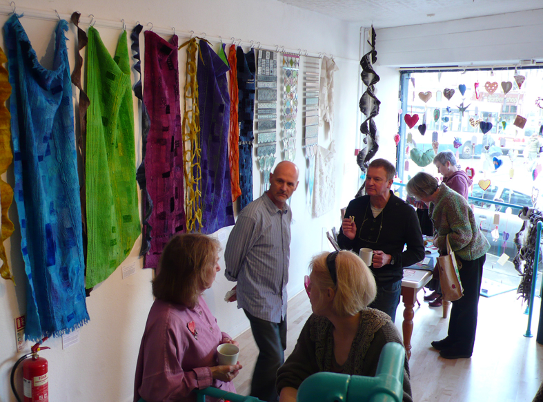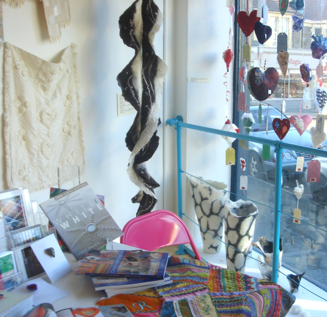 Felt making is very popular and many people are wanting to sign up to these classes, we are making them a regular weekly class along with stitching, drawing and patch-working. Janet Clarke, who I first met last year at an Xmas party, is taking the major wet – felting workshops; but she also turned out to help get the studio together, putting  up the Heart Felt exhibition in the windows with jeweller Hazel Sutton.