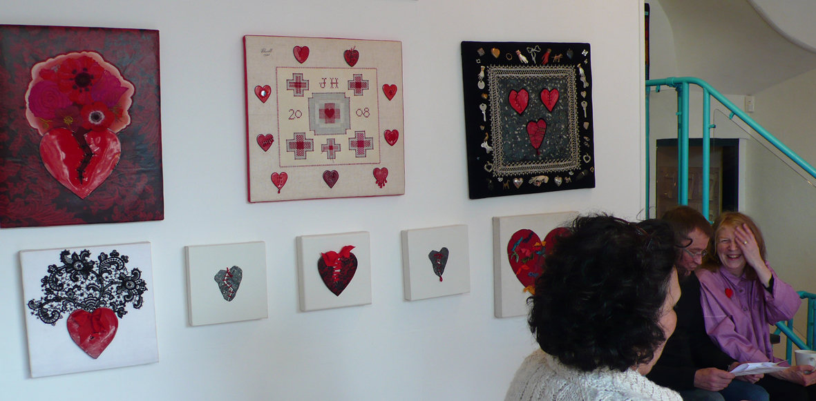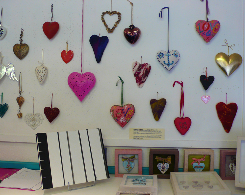 heart wall with examples of stuffed and beaded hearts our first Saturday workshop
