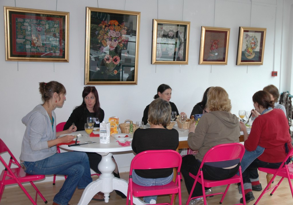 Simple lunches are always provided at our whole day workshops, I have found that eating together gives everyone, usually all complete strangers, a chance to catch up and see who does what, and very often as this is a local venue, find that they have all sorts of things in common other than a love of textiles. The food is kept simple – salads, soups, decent breads with fruit and cheese and we always cater for tricky diets – most of us have had allergy problems ourselves. Also it makes the whole experience more of a treat, students can just concentrate on the class for the whole day. Apparently this group thought they were getting wine when I brought out the stemmed glasses – fat chance – wine, then in charge of a dye vat! I don’t think so….must get new glasses to save further disappointment.