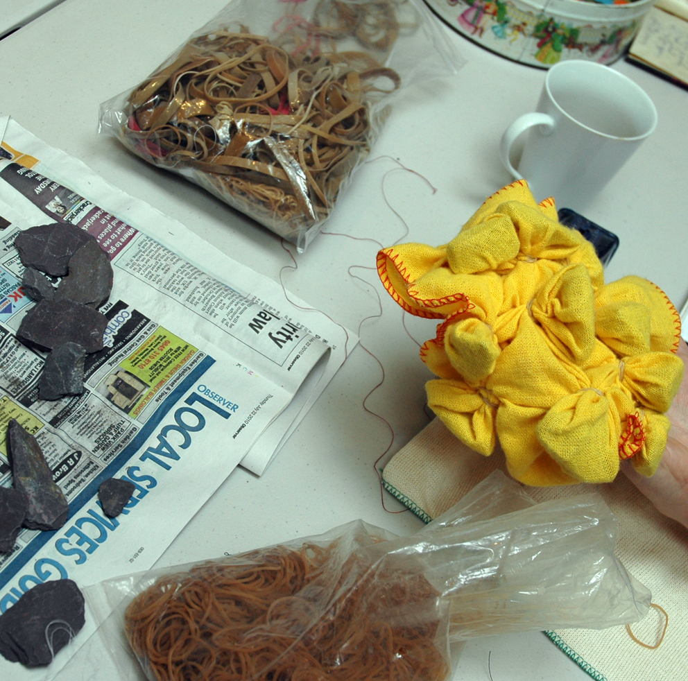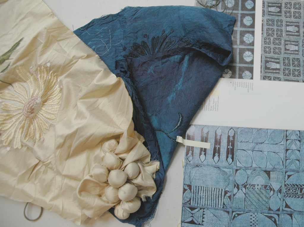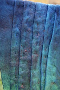 Heart Space Studios went blue last week – indigo blue, our first Shibori dyeing class by Teresa Searle who is a textile designer maker and author and now developing new workshops for us, her next class is textile jewellery and she is working on a course in experimental stitching for later in the year. When I walked into the class at mid morning there was plenty of experimental stuff going on.