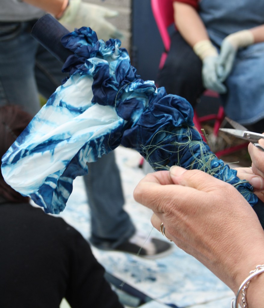 Then outside to do the actual dying, the indigo needs oxygen (and it does tend to stink) to make the reaction from deep green to that beautiful singing blue…watching the colour change is always fascinating. Teresa gave a simple and informative demo and explanation of times and strengths of dye, rigged up a washing line and let them all get on with it while being on hand to help, everyone was so excited – especially me.