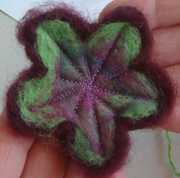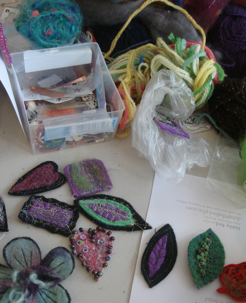 Debbie Bird makes brooches and jewellry from all sorts of stuff in her popular classes”Wear your Heart on your Sleeve”, below is a student’s first attempt at needle felt with machine stitching.