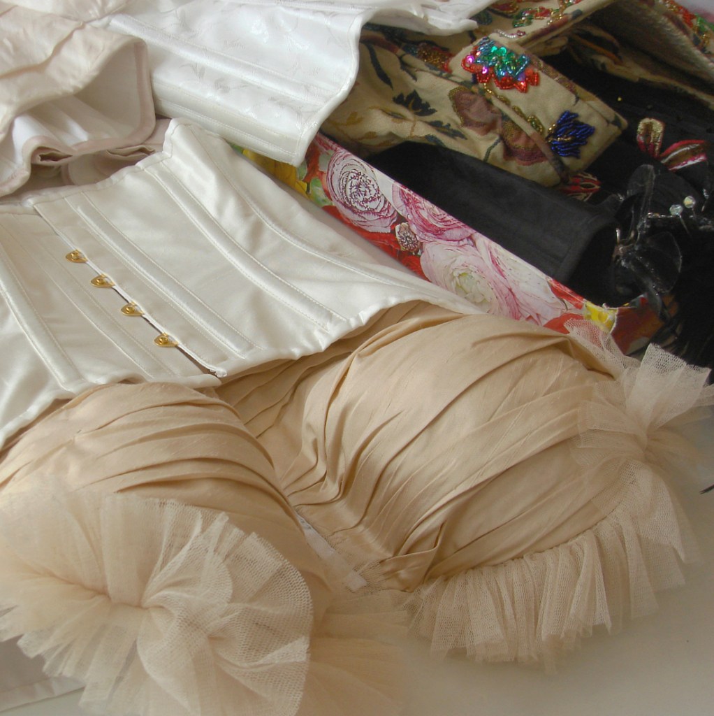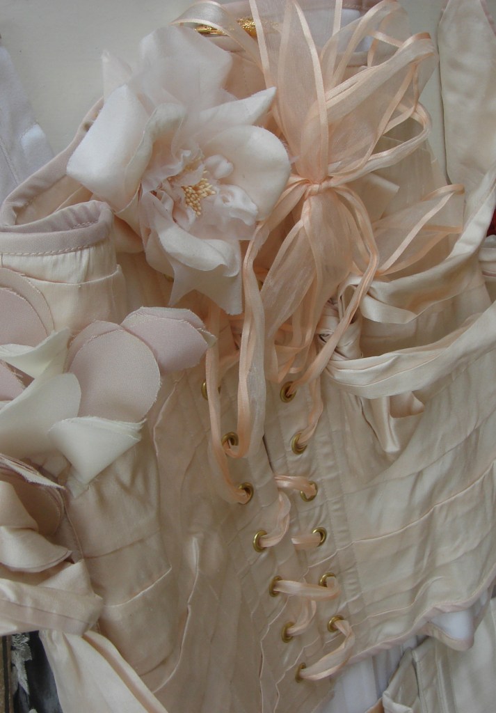 Out of a beautiful flowered box came delectable things, pale be-ribbonned silk corsets, for a fantasy wedding; ruched silk with net frills for a ballconette effect…I think I have this terminology correct!