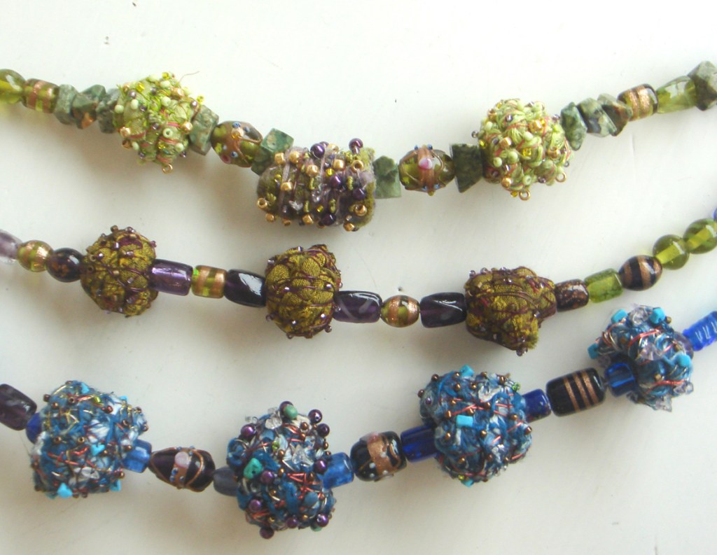 Other tutors teach how to make beautiful fabric beads, here Patricia Brownen has strung her beads with pretty glass bought beads. Stringing up to colour co-ordinate is real skill and she has developed interesting and simple ways for beginners to achieve beautiful combinations in her workshops.