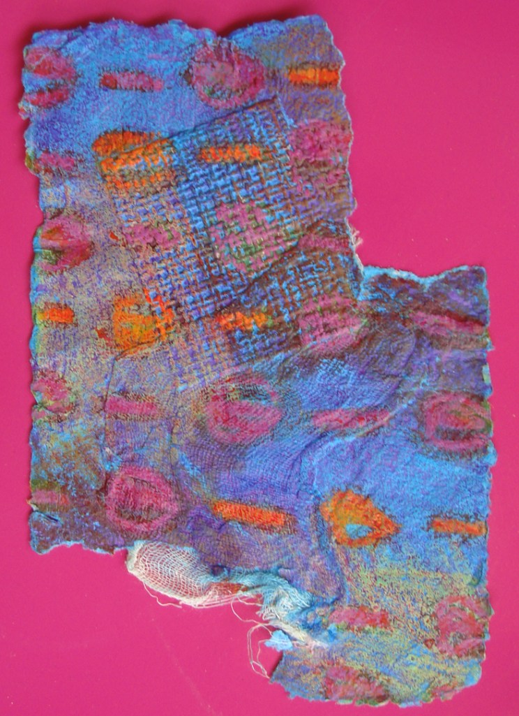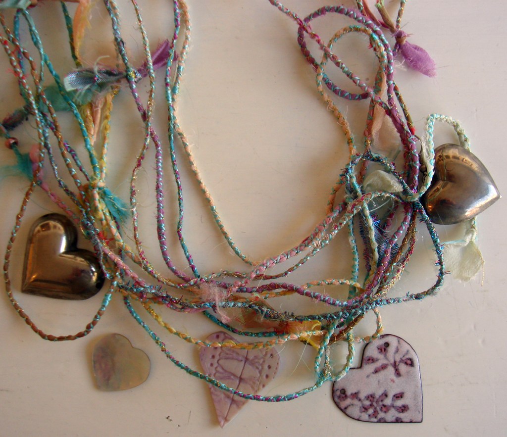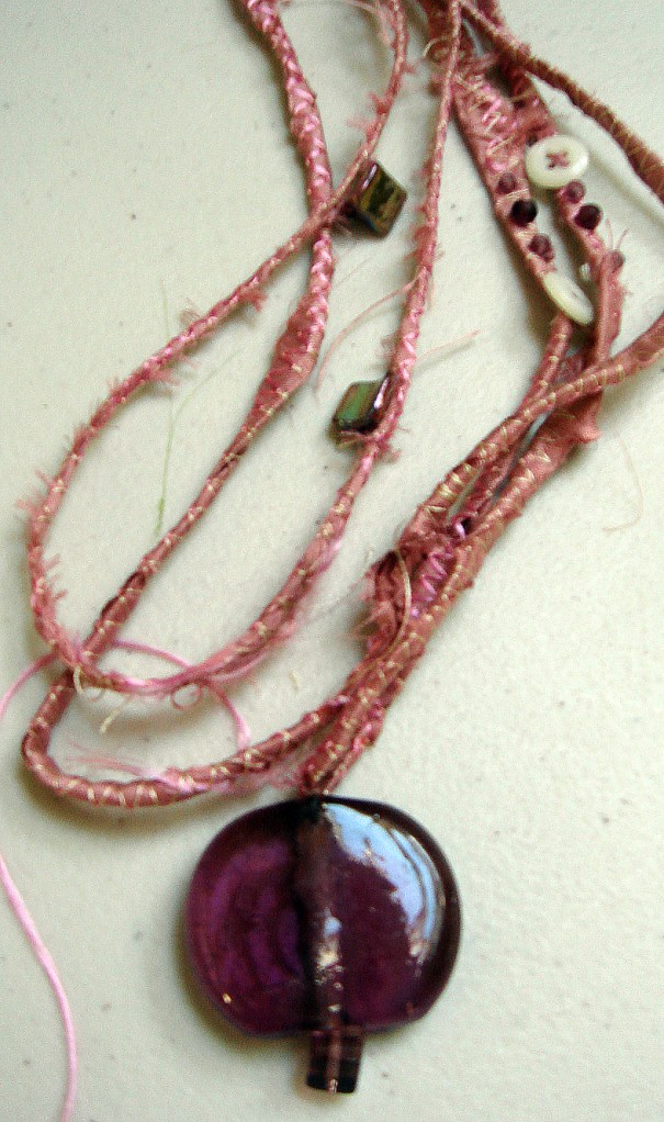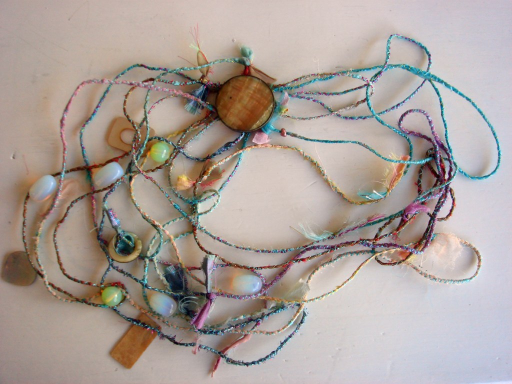 These would make lovey bracelets and necklaces if she makes them stronger, I like the idea of adding them to the fabric strings I made with Teresa. It is this combination of ideas and materials which will make our jewellry course so fascinating for everyone involved.I also think that Jan’s paper making class could develop into bead making…the combinations of colours and materials give plenty of scope for new ideas.