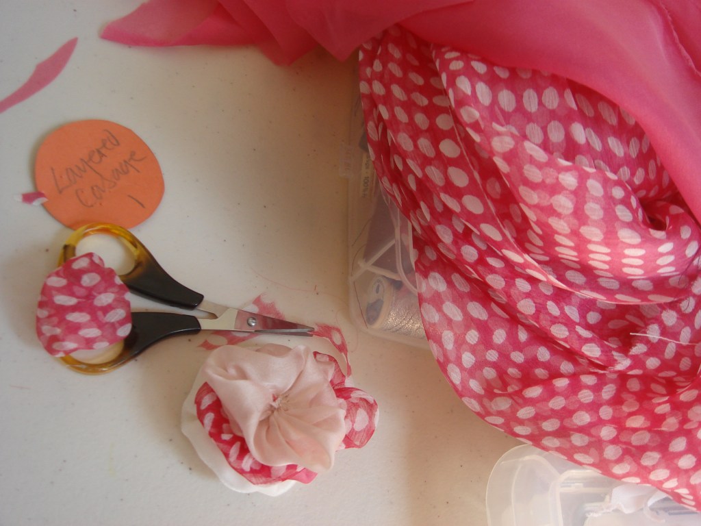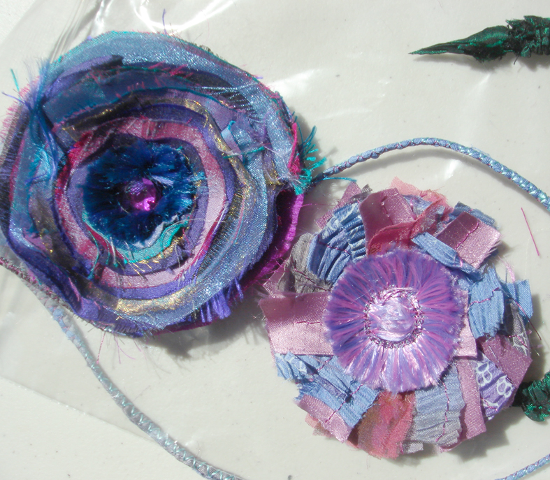 You can see just Teresa’s hand pointing out a flower brooch at her recent class, she brought a wonderful selection of samples and ideas to inspire everyone not just me. She showed us several ways of making fabric into rosettes for flowers..
