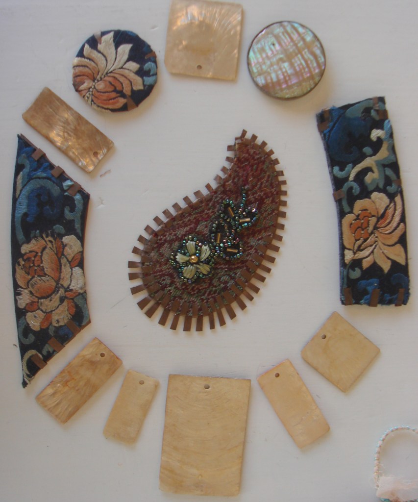 But what I really want to achieve is a mixture of media in the new course, fabric with beads, enamel, paper, wood, bone…….the idea is to get the different materials to work together so that they form new and exciting combinations for textile jewellry.