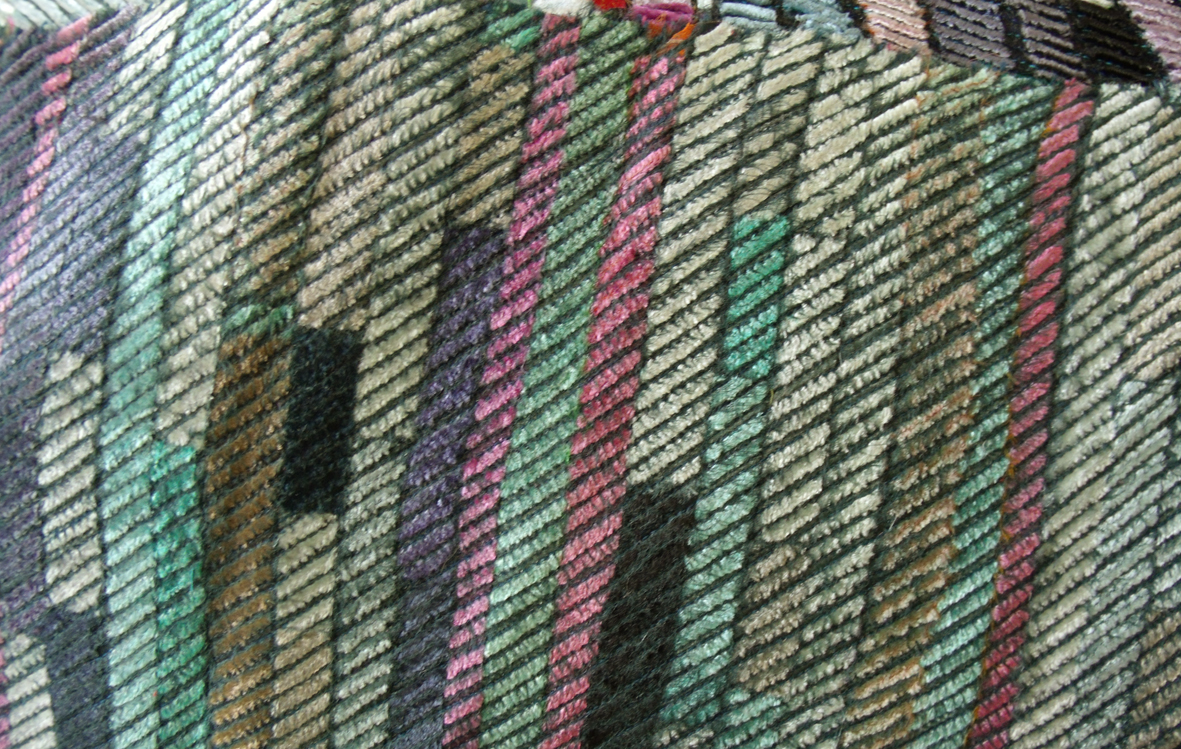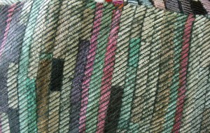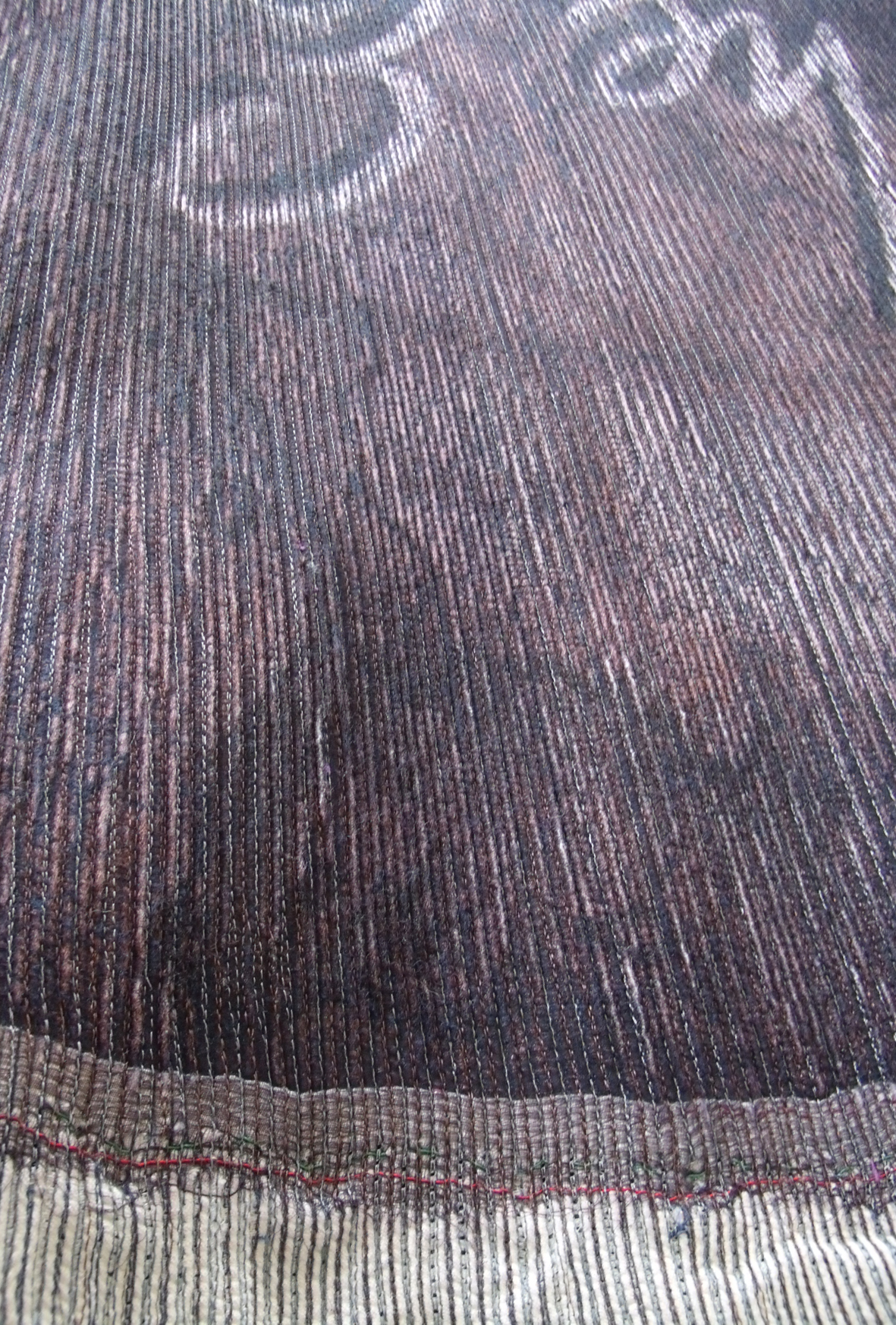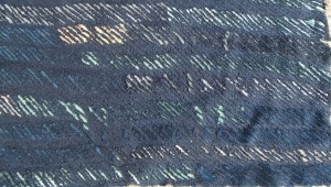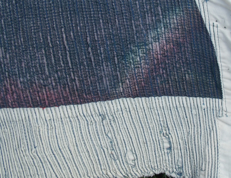 The way the colour collects and intensifies when channeled and seen against the contrasting white strip is compelling and the stitching makes the cloth feel very seductive, it rolls and folds easily in the hands and I just want to make clothes with it – an unusual reaction as I gave up designing and making clothes many years ago.