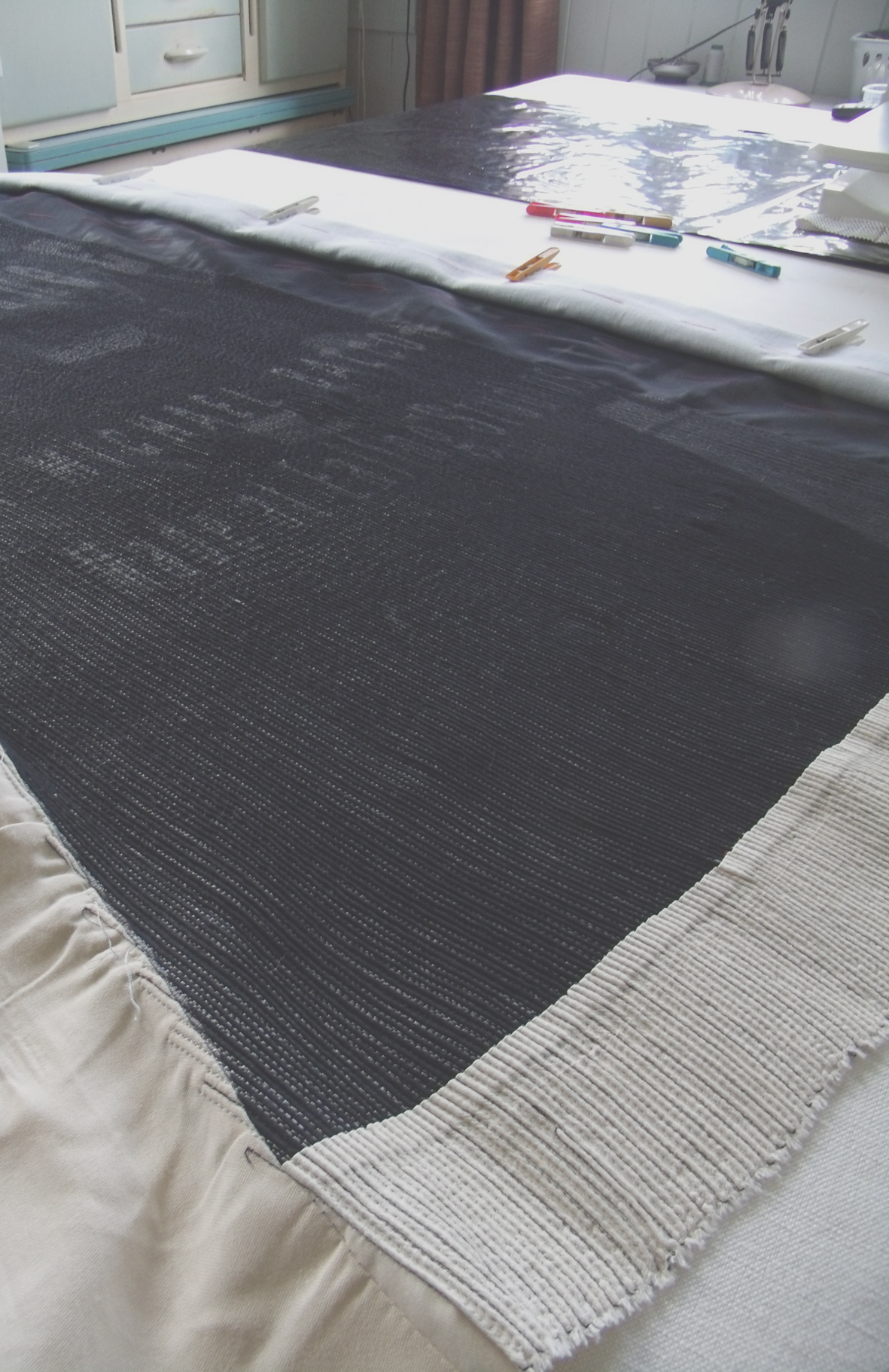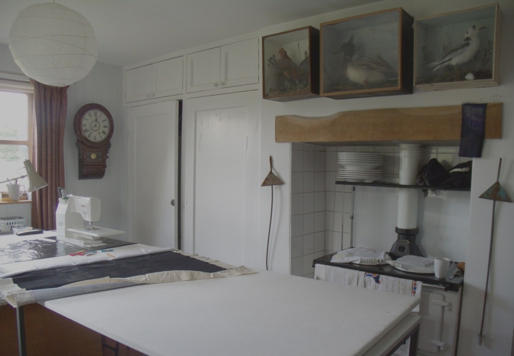 Turning around, instead of the usual kitchen table I saw a large -work-table complete with sewing machine and a half stitched sample rolled up and pegged to keep it in order – this is the lightest room in the house so I wasn’t so surprised – but no supper in here tonight.