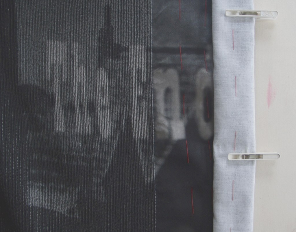 What is curious and fortuitous, is that the stitching brings into focus the enlarged and hazy digitally printed images. The large scale of this work and the intensity of the rich blacks remind me of sitting in darkened cinemas as a child, engrossed in those huge black and white films, Technicolor was the colour film of choice though. I was immediately transported back to The Rialto in New Ferry, the local cinema of my childhood home – eating chocolates and watching the Saturday matinée with my brother Colin. So strange, the sensations buried in our minds waiting for an opportunity to be delivered after some 50 years by a strict piece of stitching…….