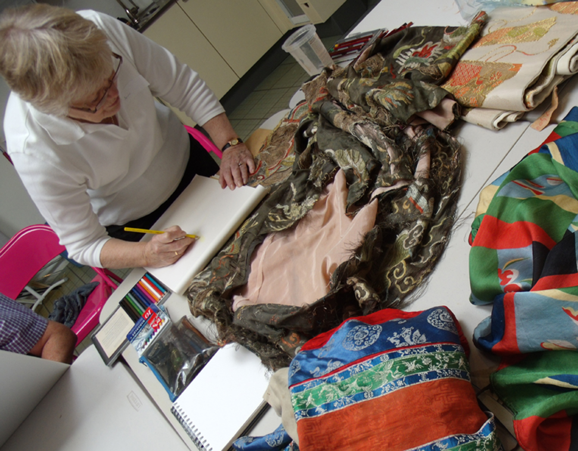 But to return to drawing, observational fine line drawing. One of the last drawings of the day, inspired by a padded silk Chinese embroidered jacket, really shows true sensitivity to the garment.