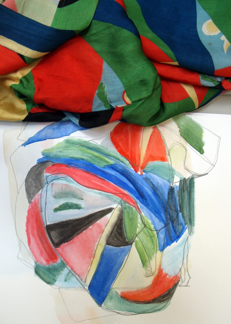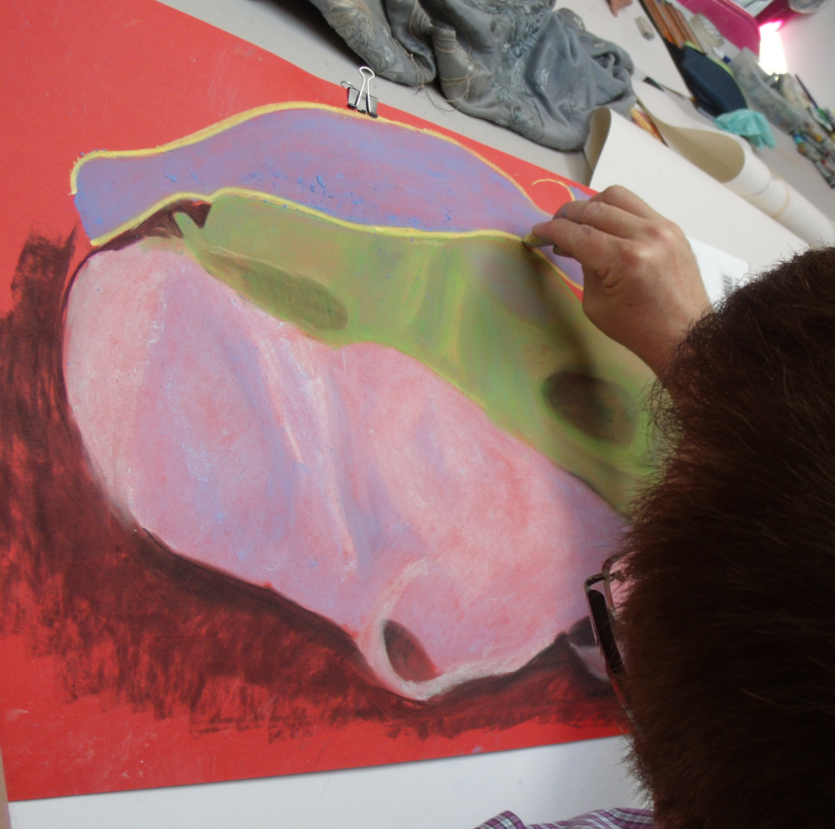 The colours are completely wrong but the effect is ravishing…now what is this about? He had decided he had finished the drawing – I could tell this before he told me – as he was scraping in some black ground colour – where non existed. But I suggested he look again at the blue silk banding on the skirt to ground the drawing rather than invent a colour to surround it – the effect was immediate and I feel he has started on a journey of really working with colour, playing with the effects of broken/nuanced colour over solid ground colours…