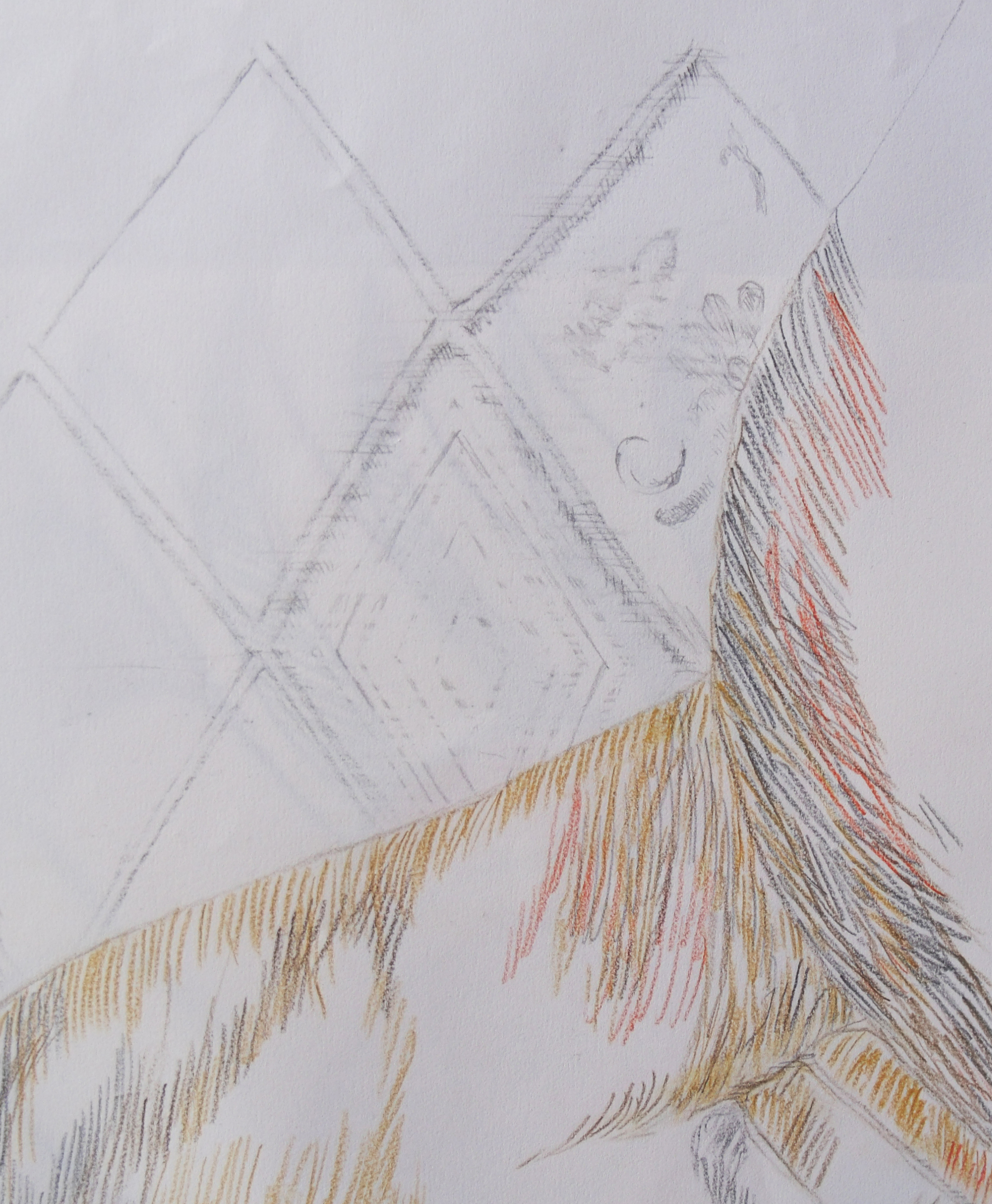 The drawing above looks more like the real feathers of a crane than the gold embroidery it emulates. I particularly admire the directional drawing of the stitching, you can tell she is a textile artsist; and the subtlety of the erased pencil lines to describe figured silk is a really imaginative drawing technique.