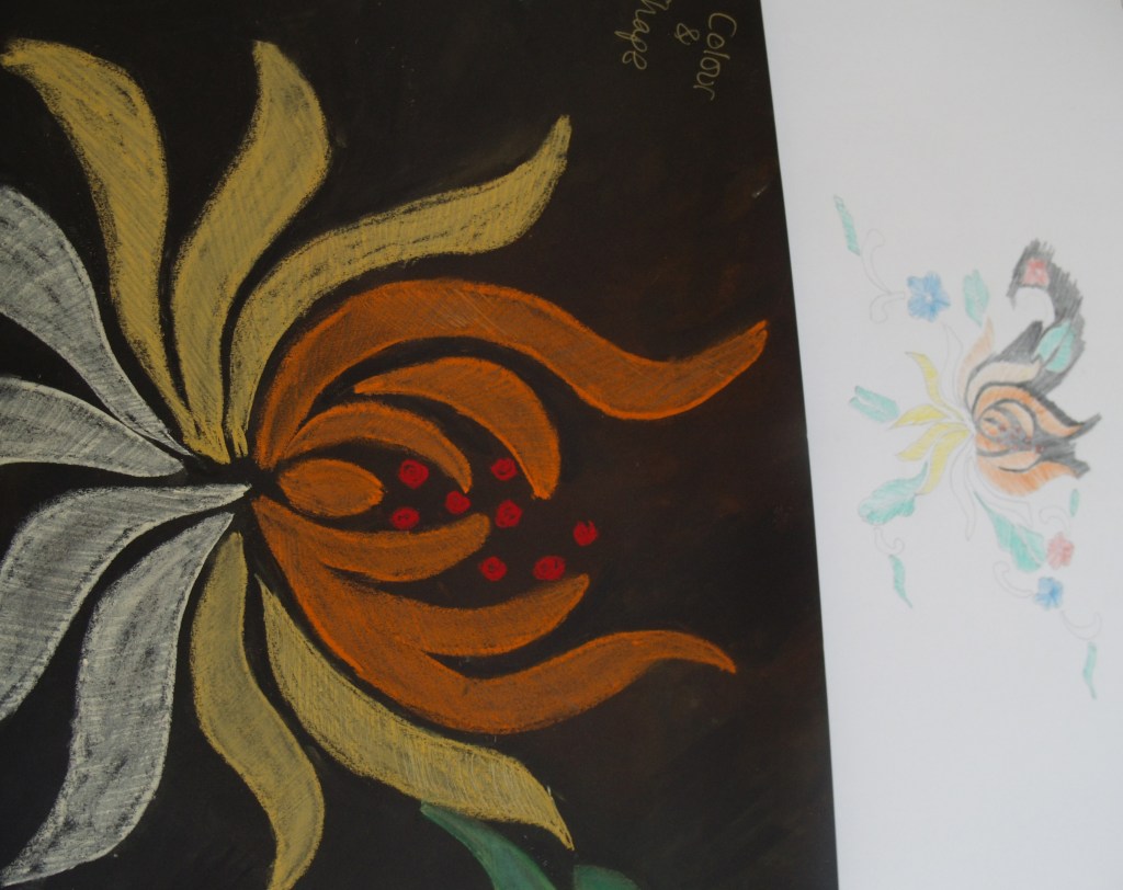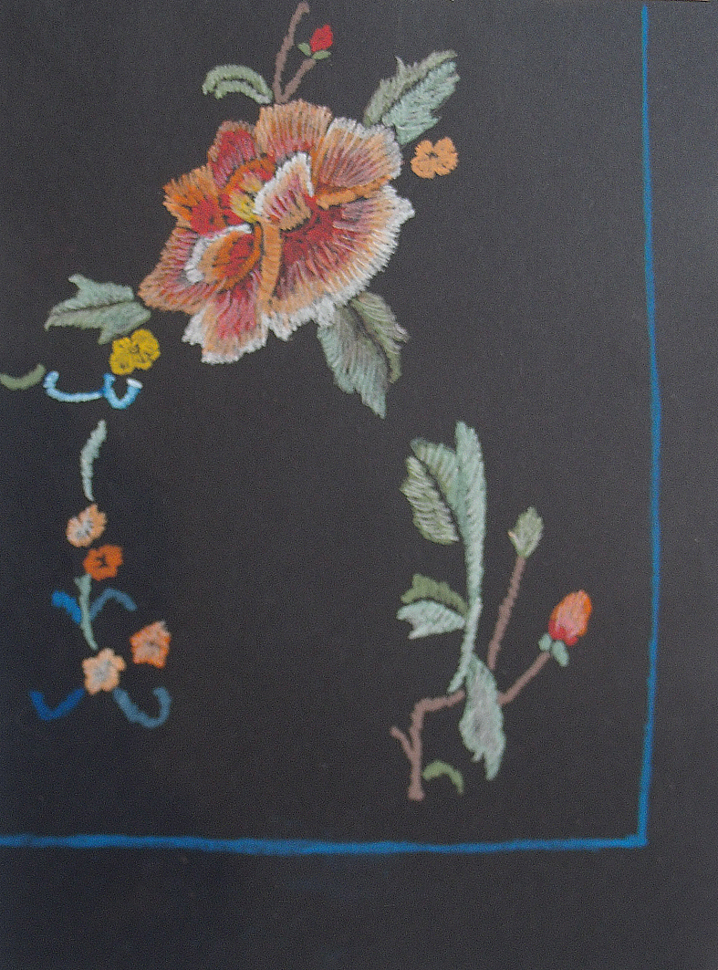 and to finish where I started, here is a pastel study from a modern Chinese embroidered jacket, the student really had been having a bad drawing morning – trying to change the habits of a lifetime in one day – eventually she settled down to a whole afternoon of careful and precise study and here is the very satisfying result.