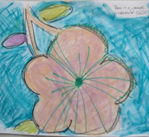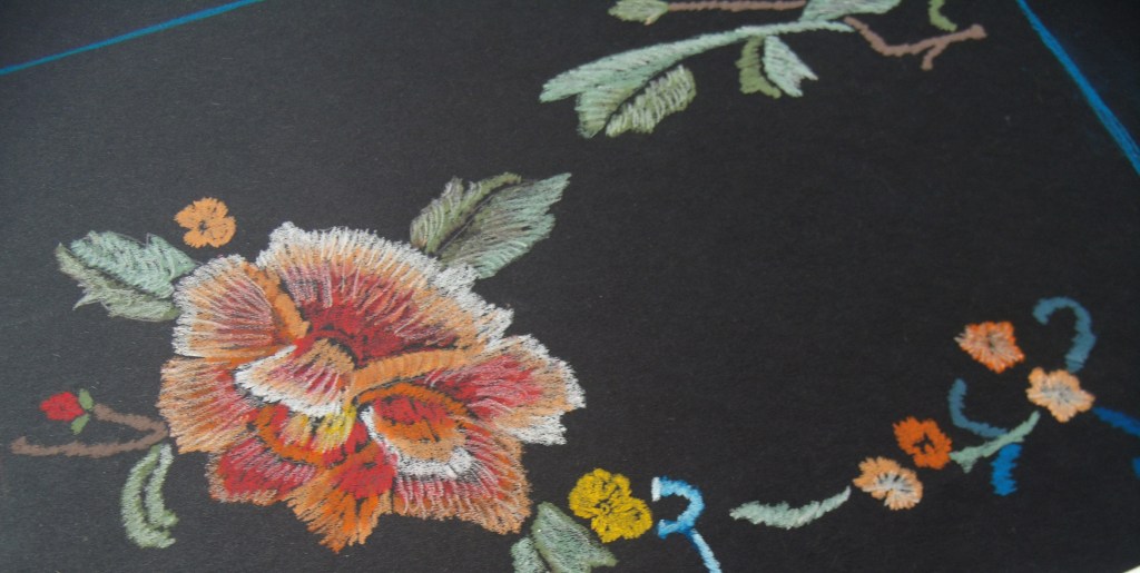 this ‘jaunty, exhuberant flower’ is in response to this minute and exquisite embroidered flower on the tassel tag of a Chinese skirt. The artist assured me that she felt a lot better by the end of the day ….she was drawing for some other purpose than the one I had proposed – no problem, I’ll rein her in at the  next workshop.