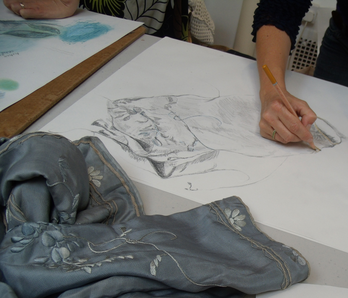 After the first critical overview I suggested that everyone concentrates on getting the colour is the priority for the next drawing of the same fabric, not so easy but still a searching is apparent in the drawing that gives it a life of its own.