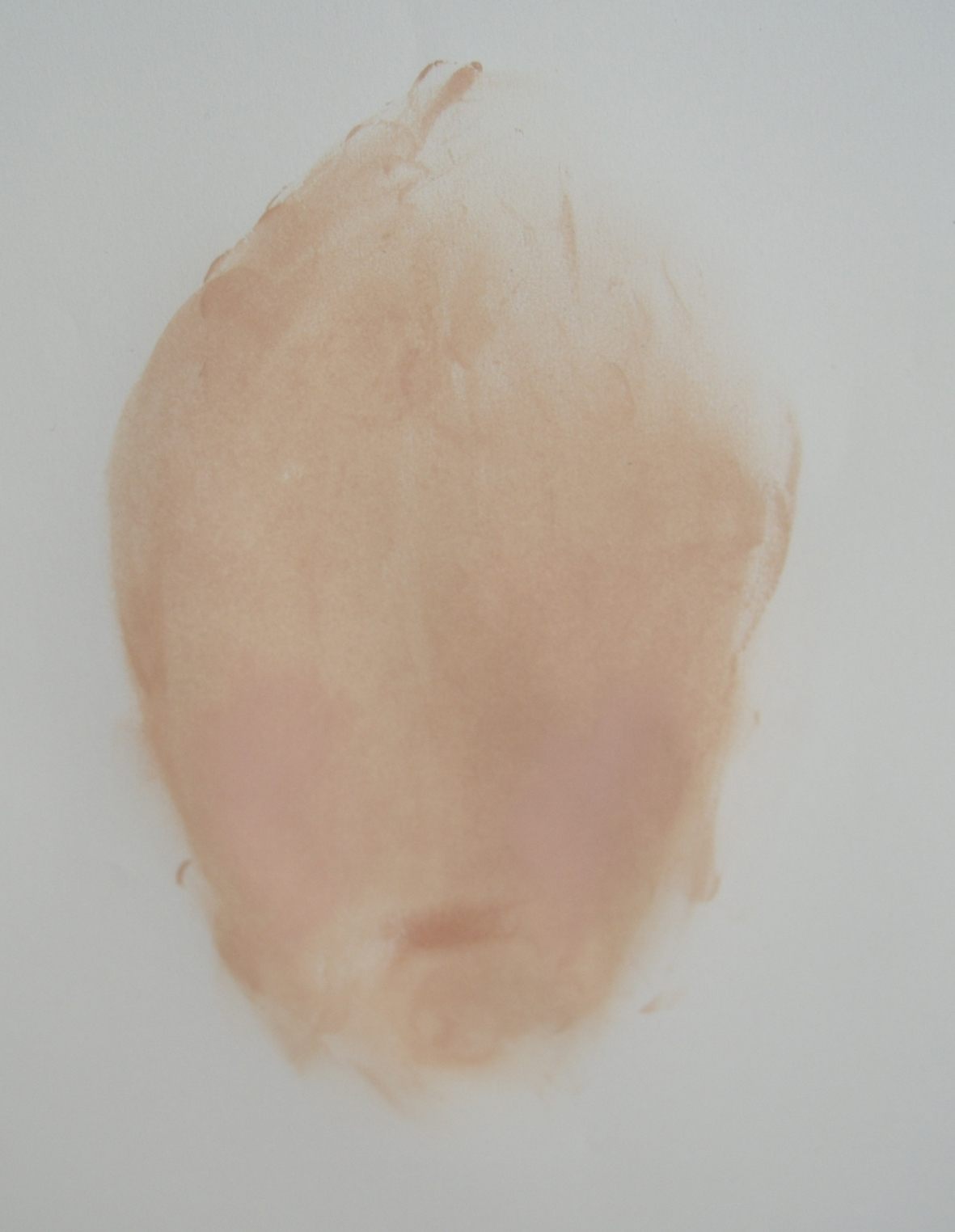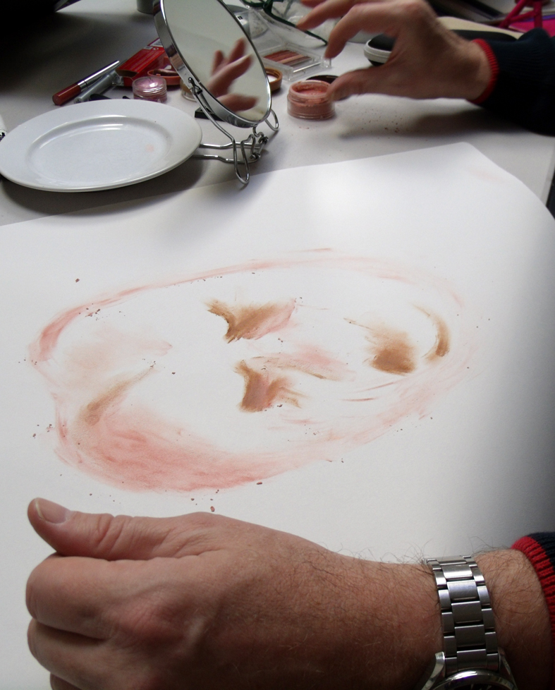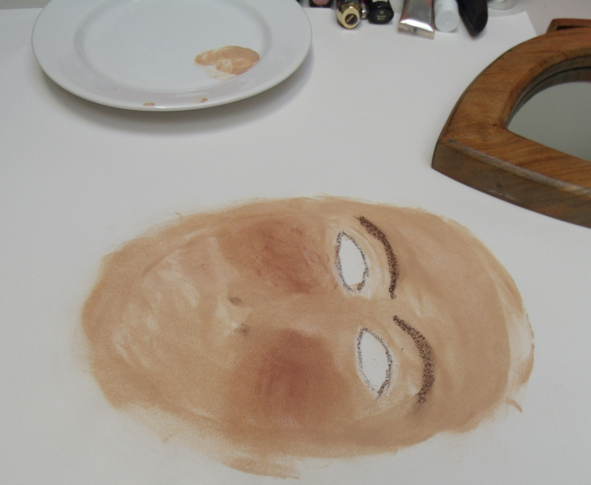 The slow build up of the subtle colours, above, was interesting to watch because eventually the tacit knowledge of applying make- up for years results in carefully modulated tonal drawings. But eventually gestural drawings developed as people started to realise the potential of media. the drawing below has been made without using the techniques to apply of make- up.