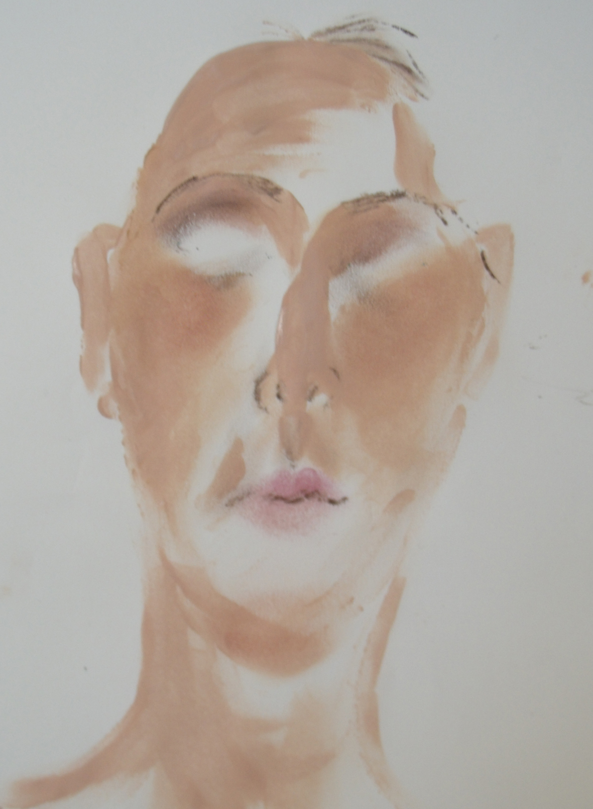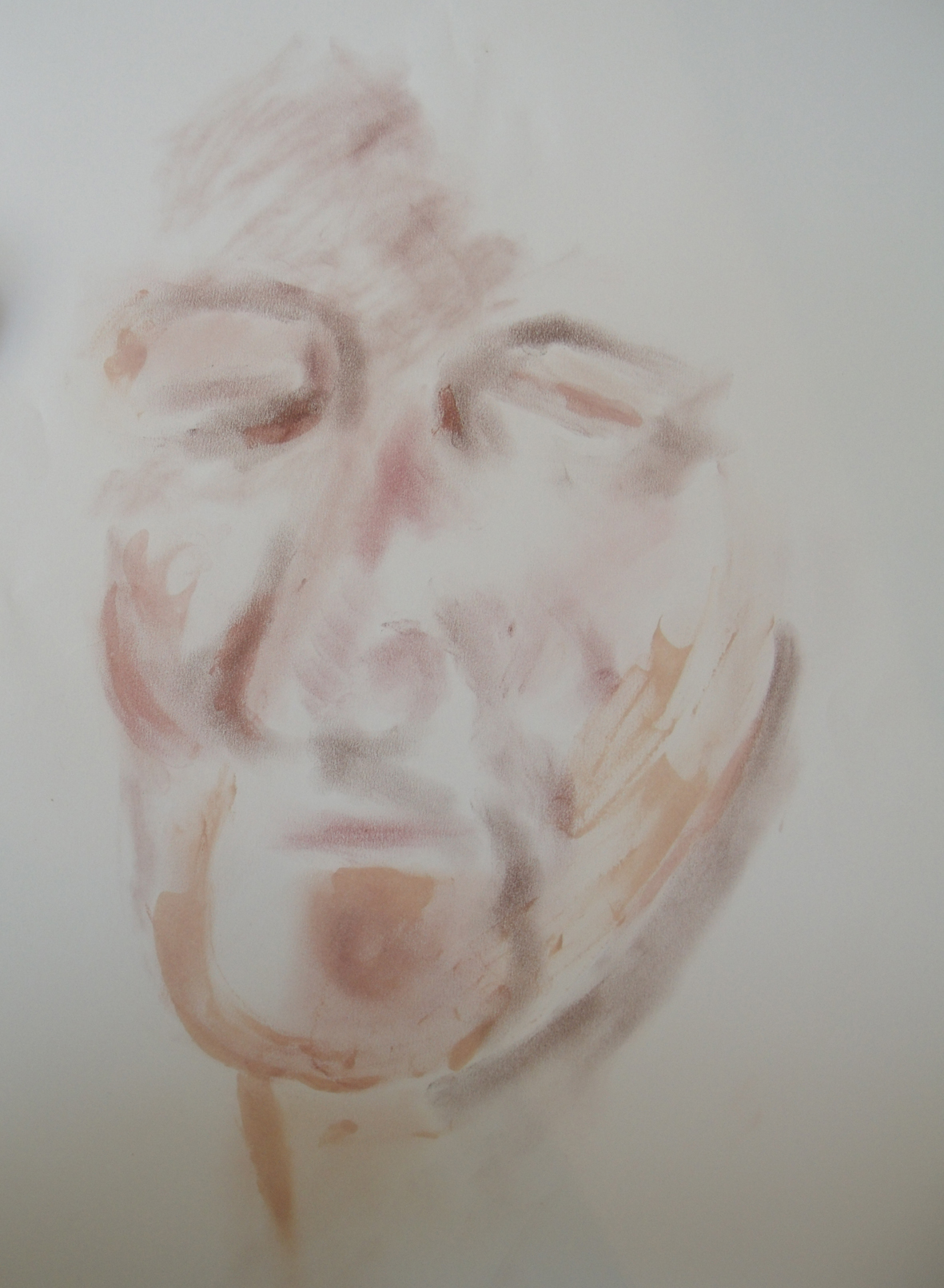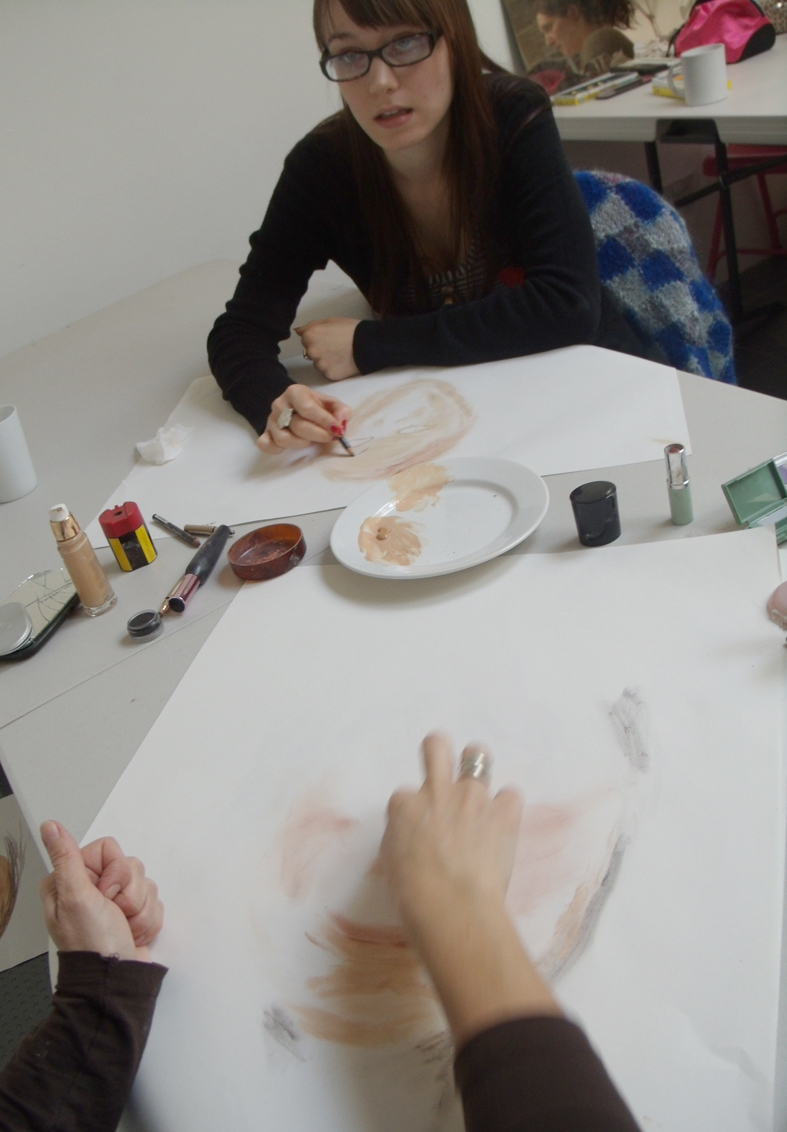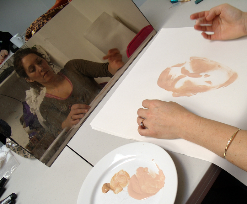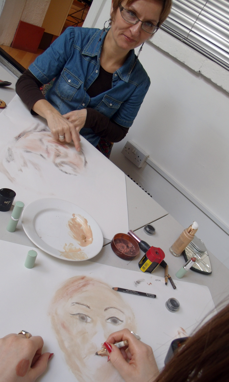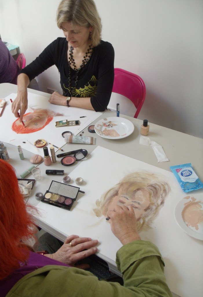 The Sunday Drawing Club that I conduct at Heart Space Studios, continues to surprise and fascinate me..this week 2 old and trusted classes in totally different ways of drawing portraits – with difference. In the morning we began by using make -up to draw with, so no long sampling sessions to get the skin colours, but a real battle to manipulate the media.