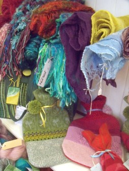 And the pile of scarves hand knitted by Sarah Thorpe go happily with Janet Clarke’s beautiful soft coloured felts. For real winter warmth, the knitted and felted Hot Water Bottle Covers and neck warmers made by Steph Wooster all mingle together.
