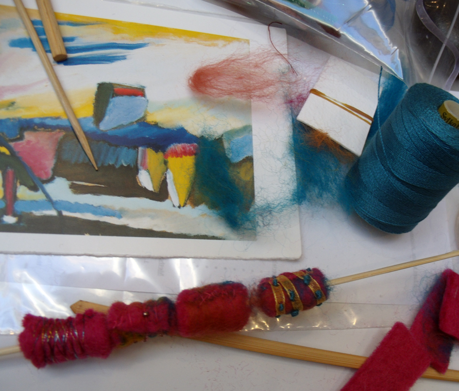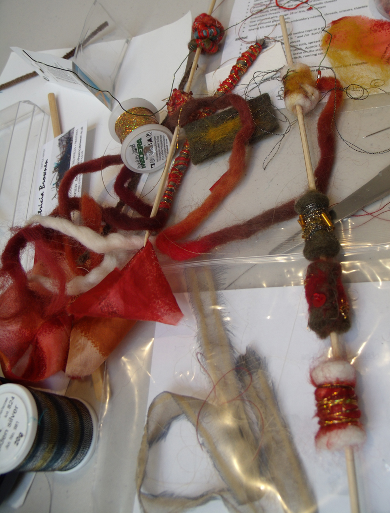 There are 2 types of bead made in the workshop, one involves rolling pipe cleaners with fabric and threads and then stitching through the roll to hold everything into position, the second type is rolled felt that can be needle felted and wrapped and secured with coloured threads.