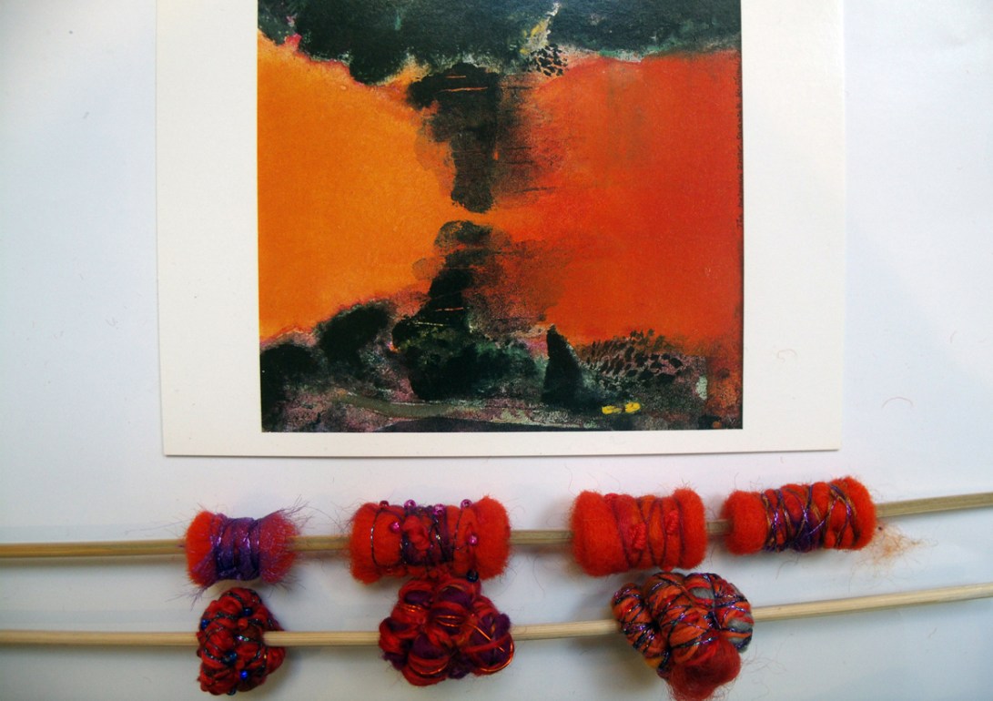 Students get to choose from whole range of different postcards, from impressionist paintings to modern textiles, anything where colour is paramount and abstract images are better than figurative, but you could make your own inspirational cards…..