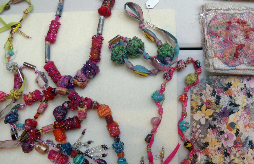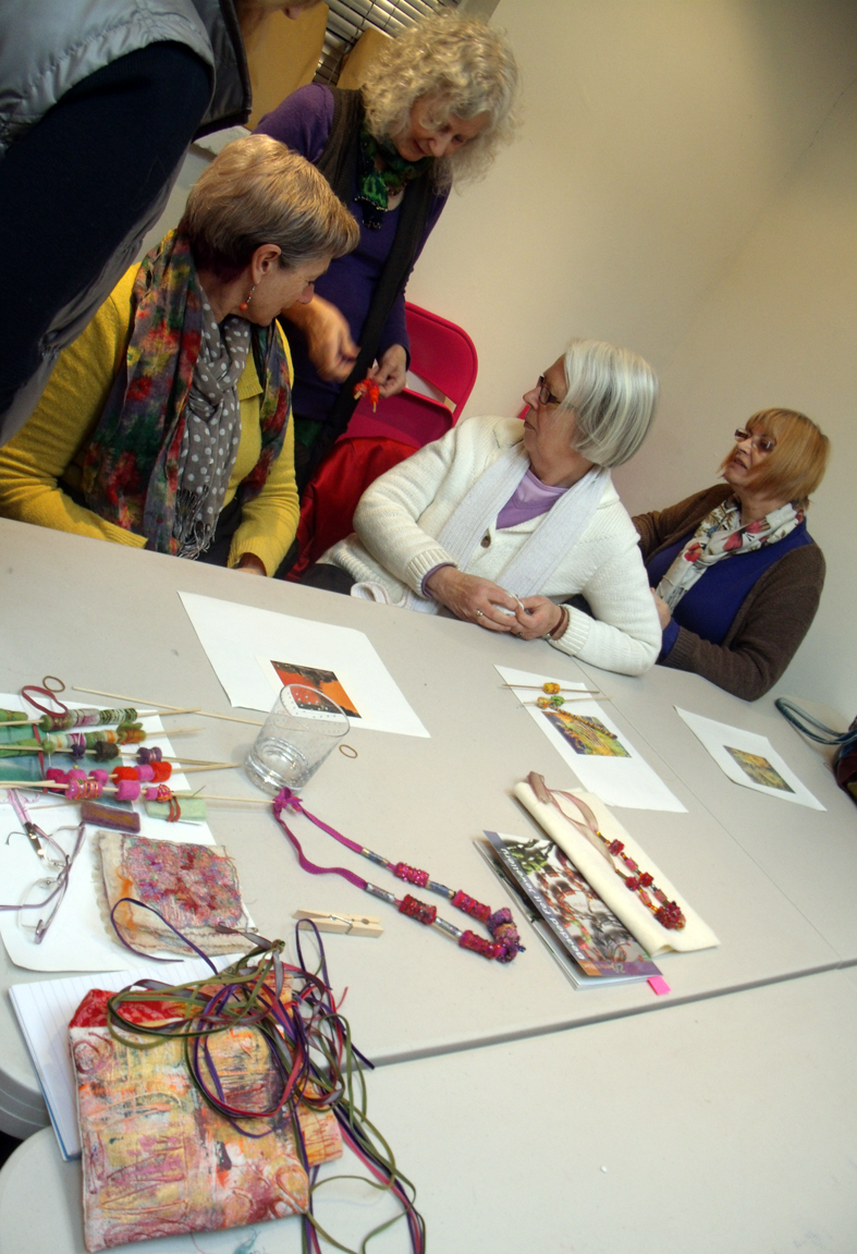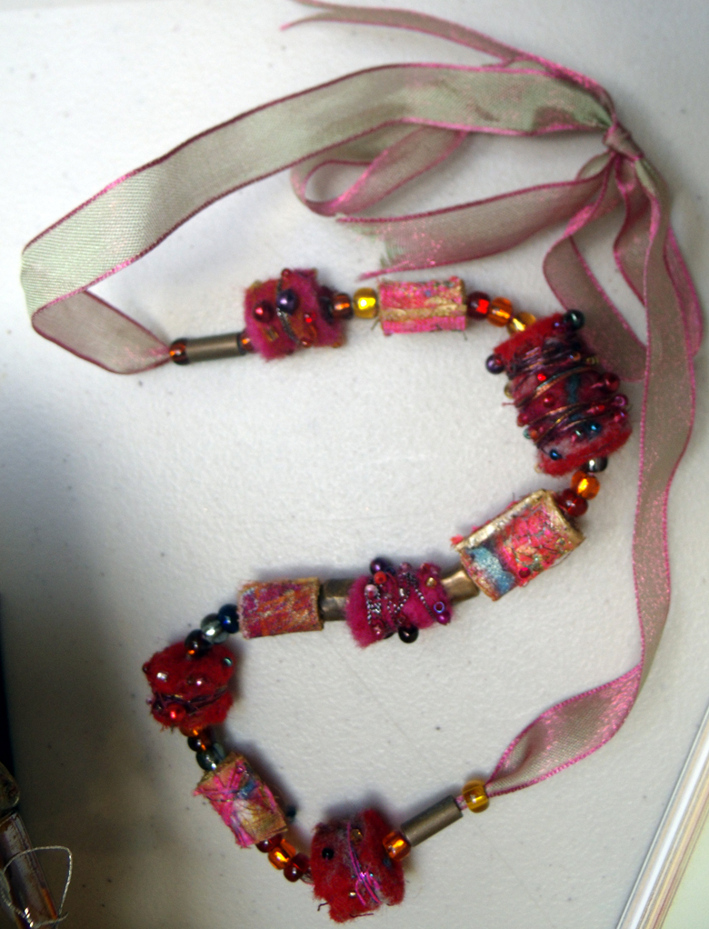 Heart Space Studios is one year old this week, so we repeated our first ever class, Making Fabric Beads with Patricia Brownen, and the results are as desirable as always. This is one of our most popular classes and the original report also receives many hits on this blog, so I  thought I would show the successful process of designing and making the beads.