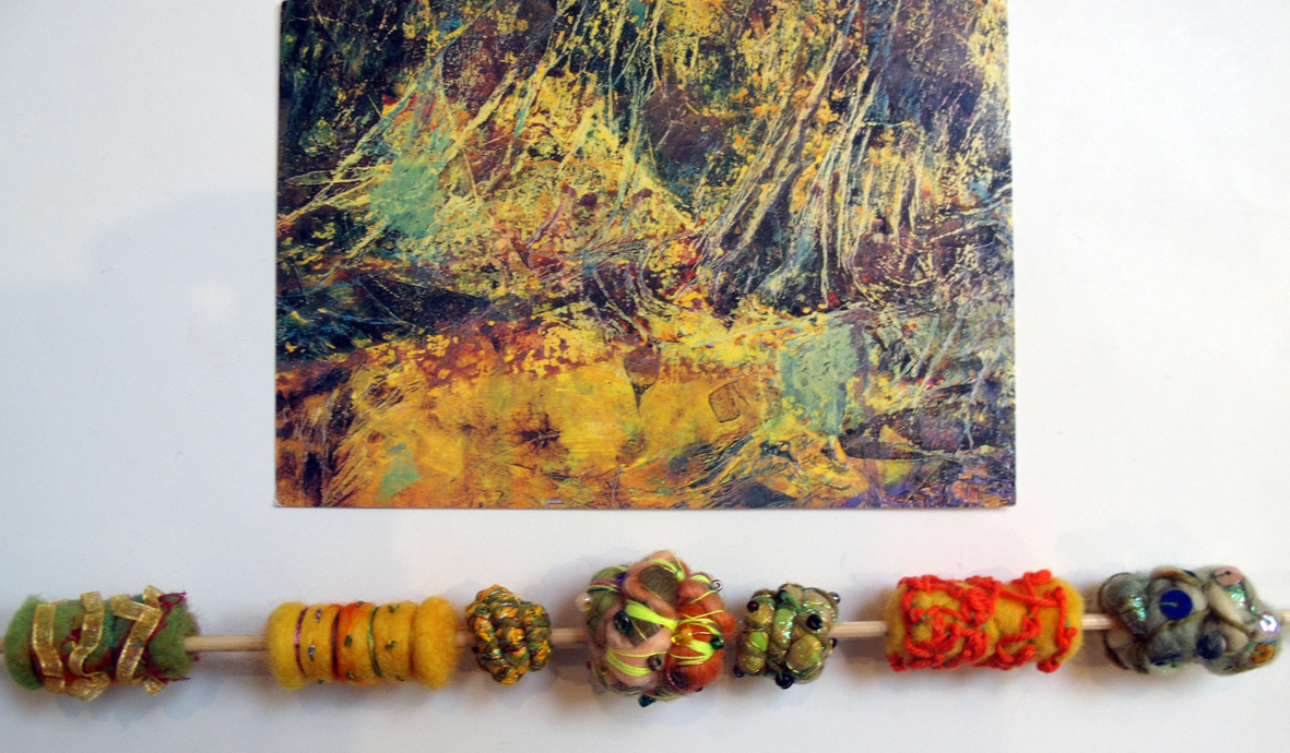 Working to the postcard colours ensures a good range of co-ordinating beads, below are samples of both the wrapped felt ( white long bead)  and pipe-cleaners( 2 blue knobbly beads.)