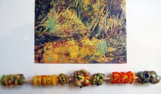 I was so impressed by the results of the colours achieved by working with the postcards that I have made a small selection of the finished beads and their cards. They almost formed a rainbow – soft blues and turquoise…